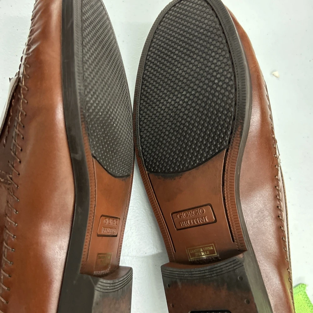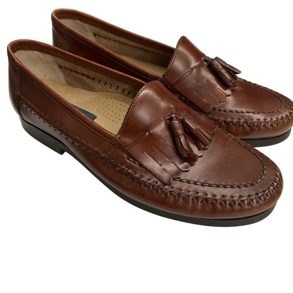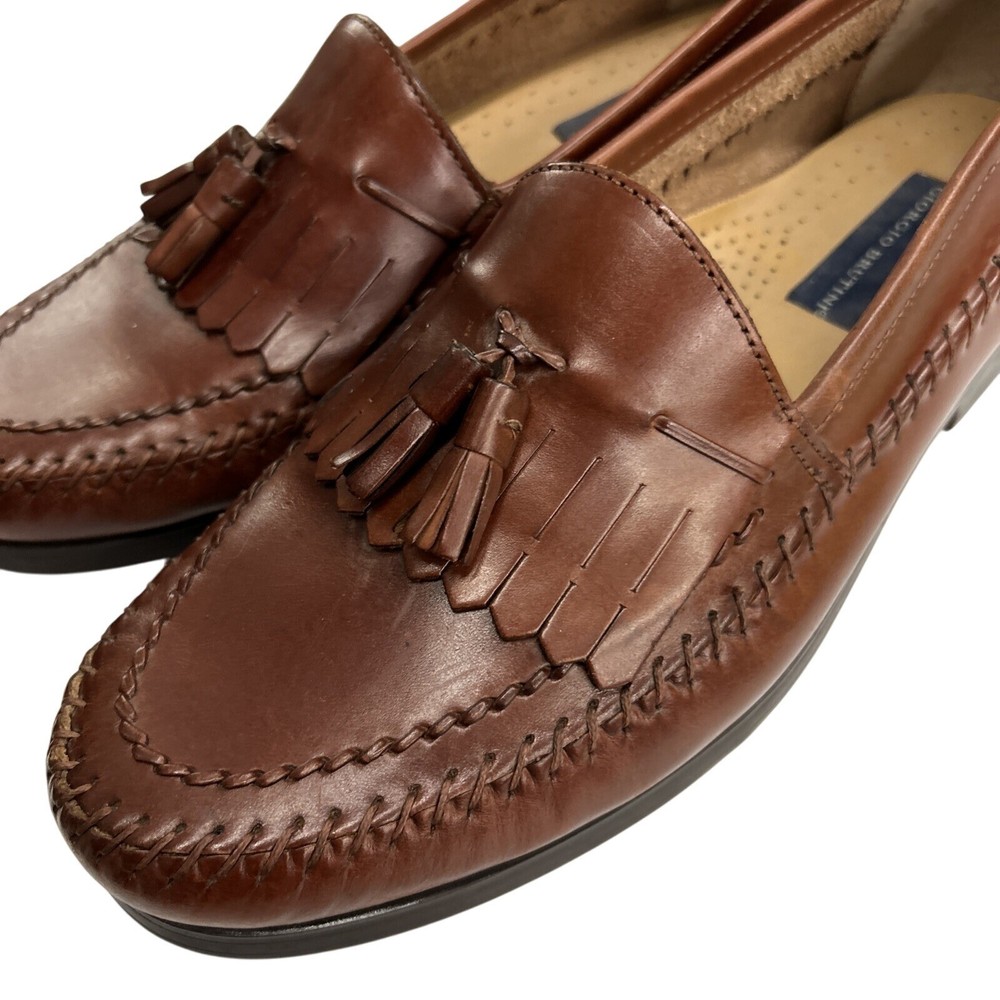 The Men's Giorgio Brutini Brown Leather Woven Tassel Loafers Shoes in size 11D are stylish and elegant dress shoes perfect for various occasions. Made with leather lining, upper material, and insole, these slip-on loafers feature a closed toe design with tasseled accents. The shoes are crafted in Brazil and have a durable rubber outsole, making them suitable for year-round wear. Ideal for holidays, birthdays, or special occasions, these loafers are a luxury choice for the modern gentleman.