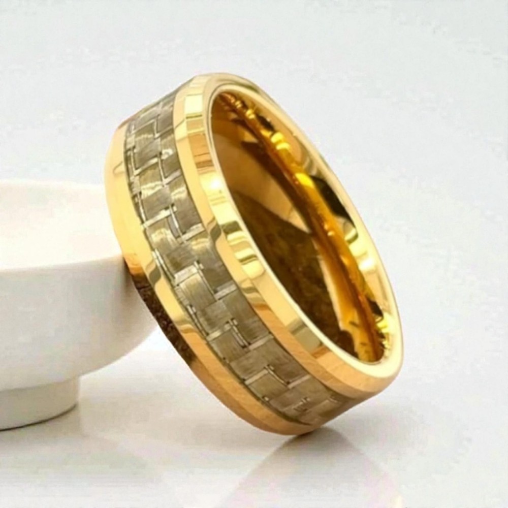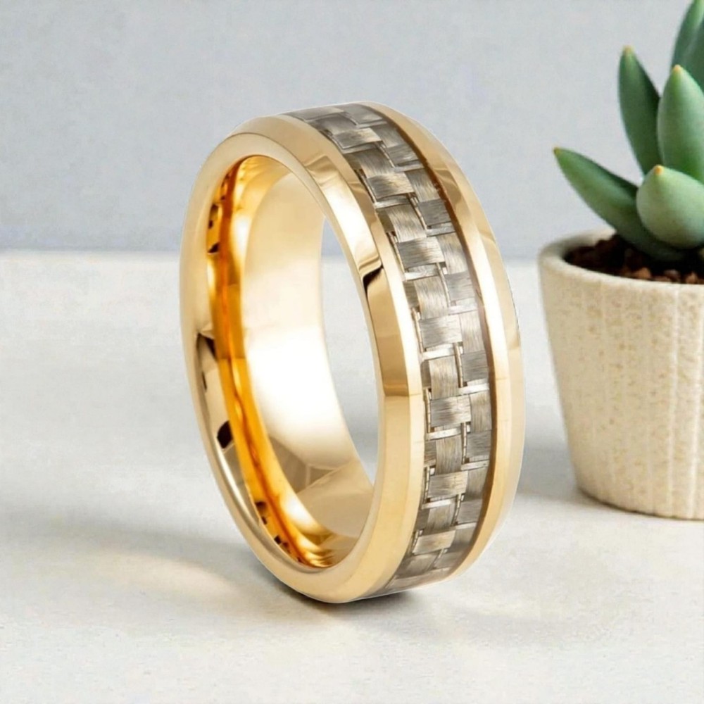 This Men's Gold Tungsten Wedding Band with a Carbon Fiber Inlay is a stylish and durable choice for special occasions like weddings, anniversaries, or birthdays. The round shape and 8mm band width give it a modern and sleek look, while the personalized engraving adds a unique touch. Made in the United States by tungstenusa, this ring is nickel-free and features a Viking, biker, or love-themed design, making it a meaningful and distinctive piece of jewelry.
