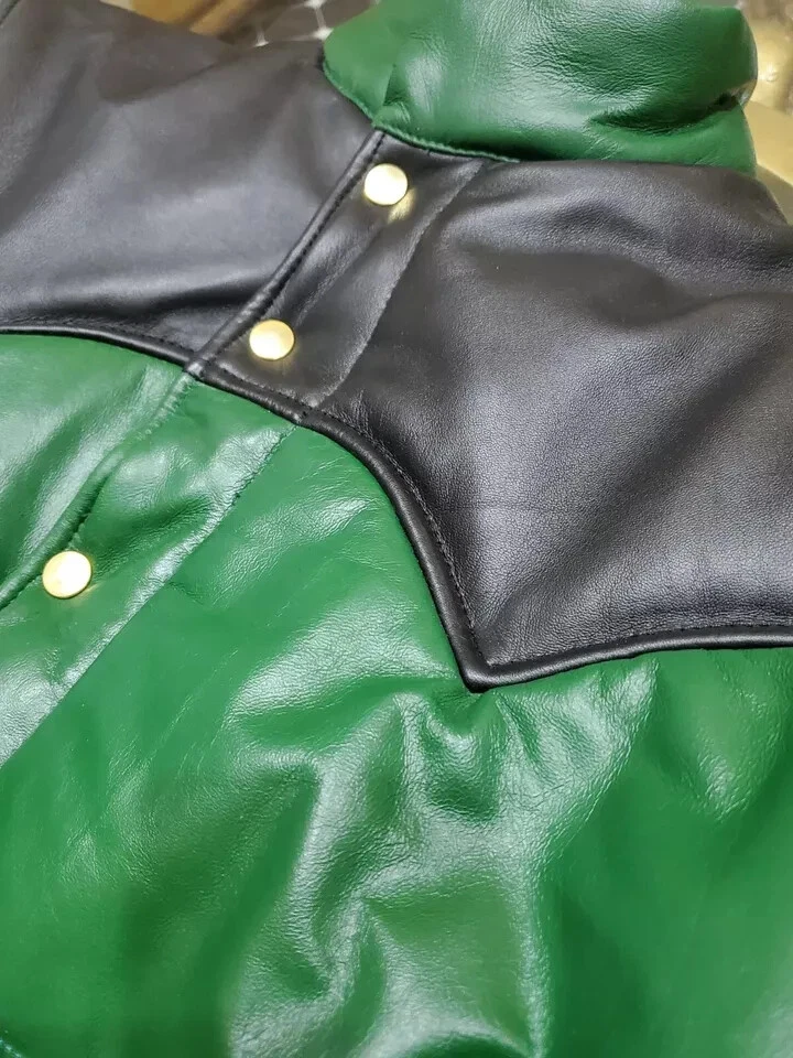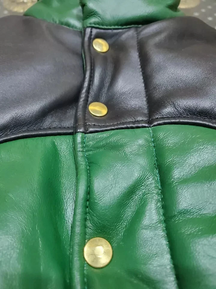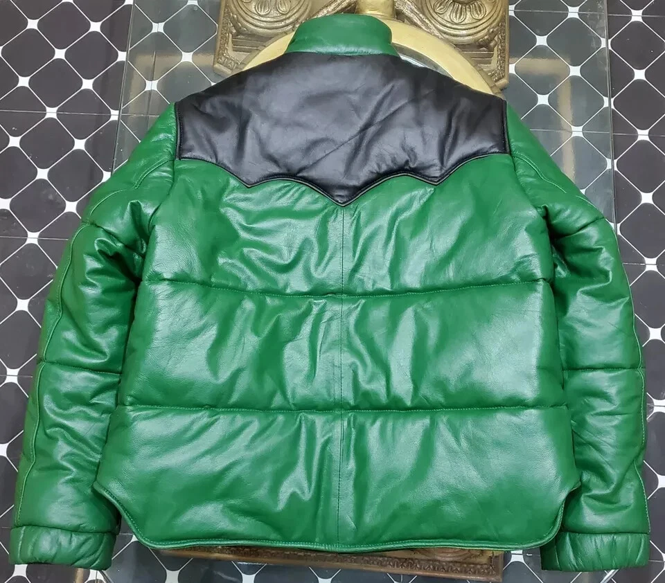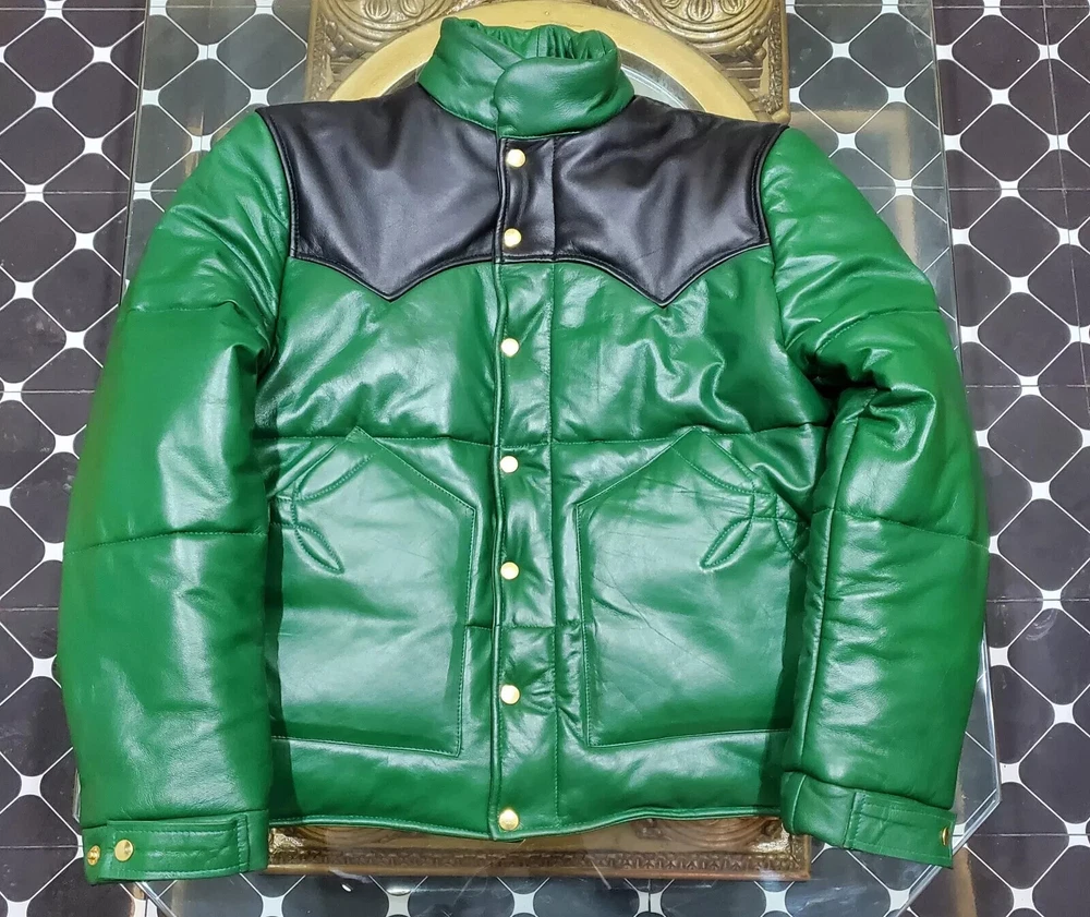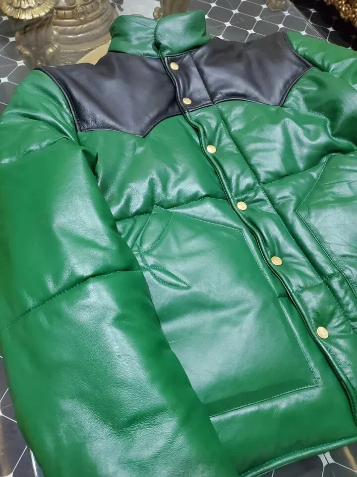 Mens Green Genuine Leather Lambskin Padded Quilted Leather Down Puffer Jacket