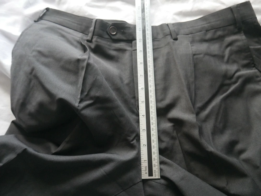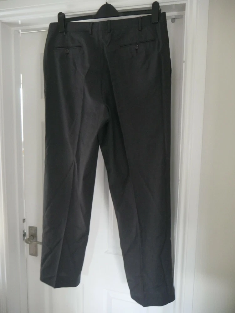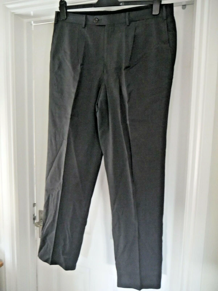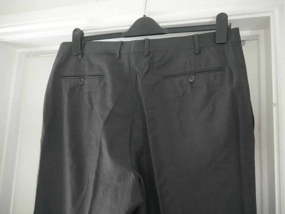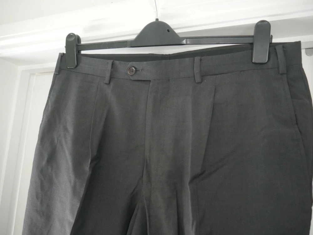 These trousers are in excellent condition. They are pleated. They have a fine check pattern all over. They are plain grey. They have the traditional pockets at the side and 2 on the back. Please see photos for material breakdown and measurements. The fabric has no stretch so measurements seen are maximums.