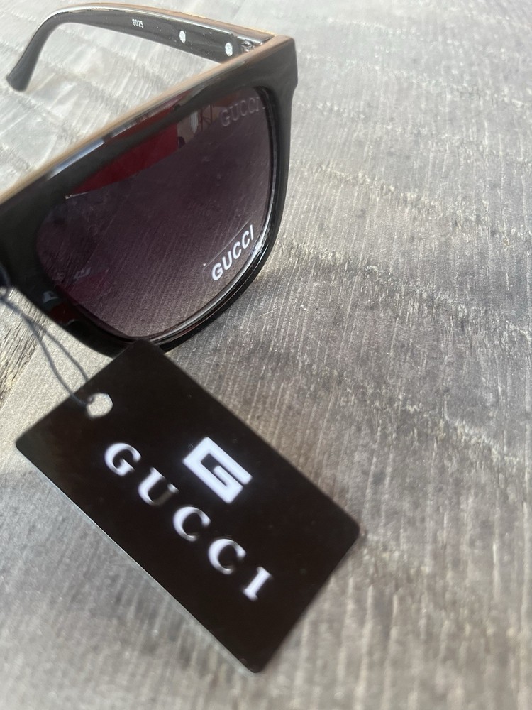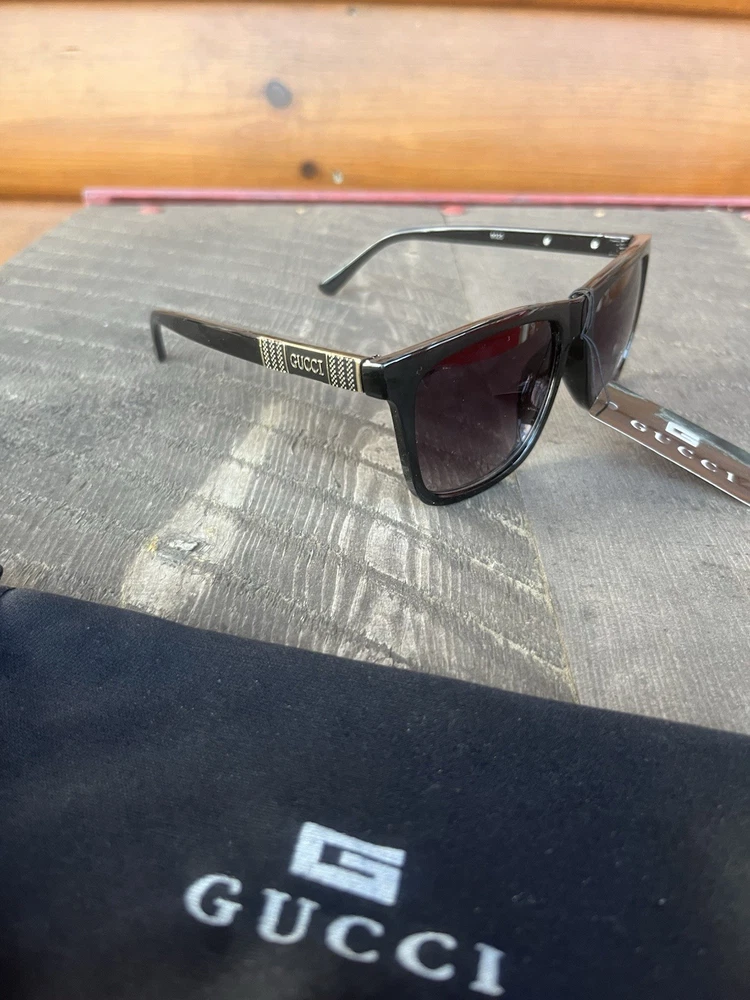 These Men's Gucci Sunglasses feature a solid black frame with tinted polycarbonate lenses offering UV400 protection. The designer sunglasses have a vintage look with a temple length of 145mm, making them a stylish and functional accessory for any man's wardrobe.