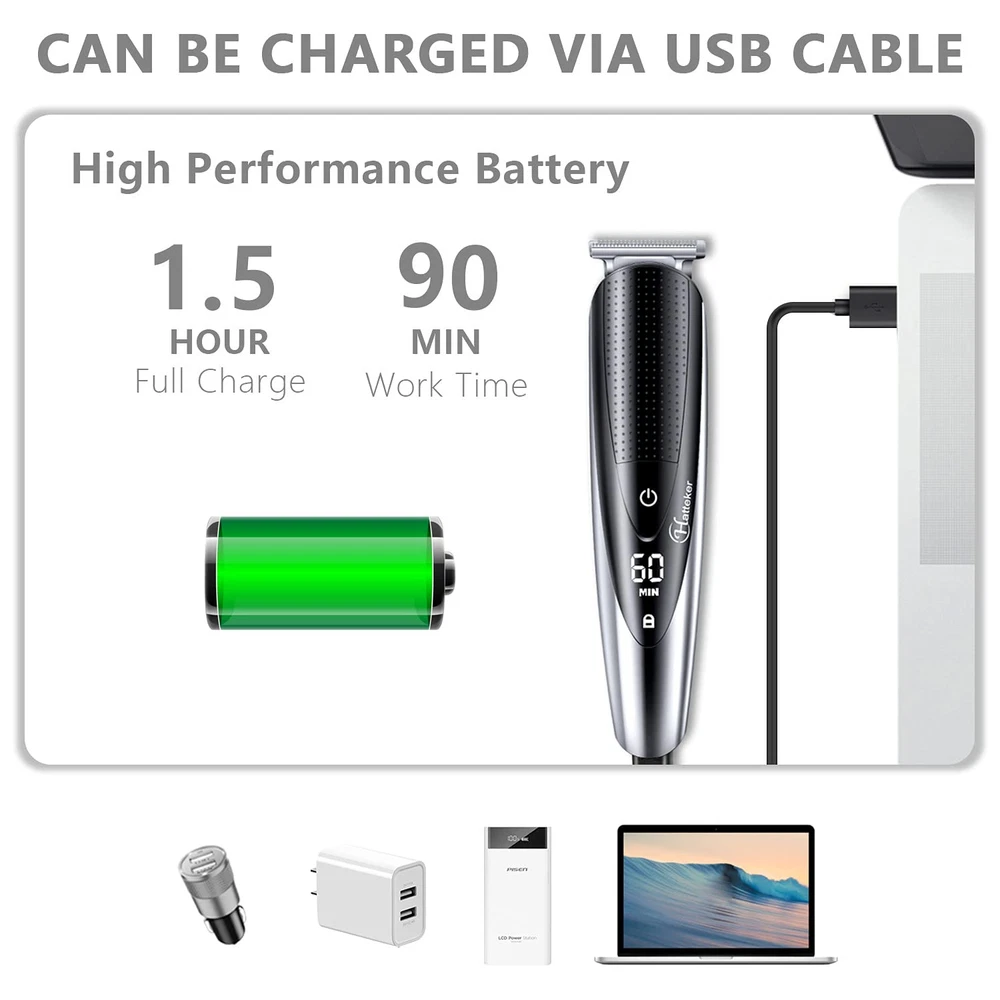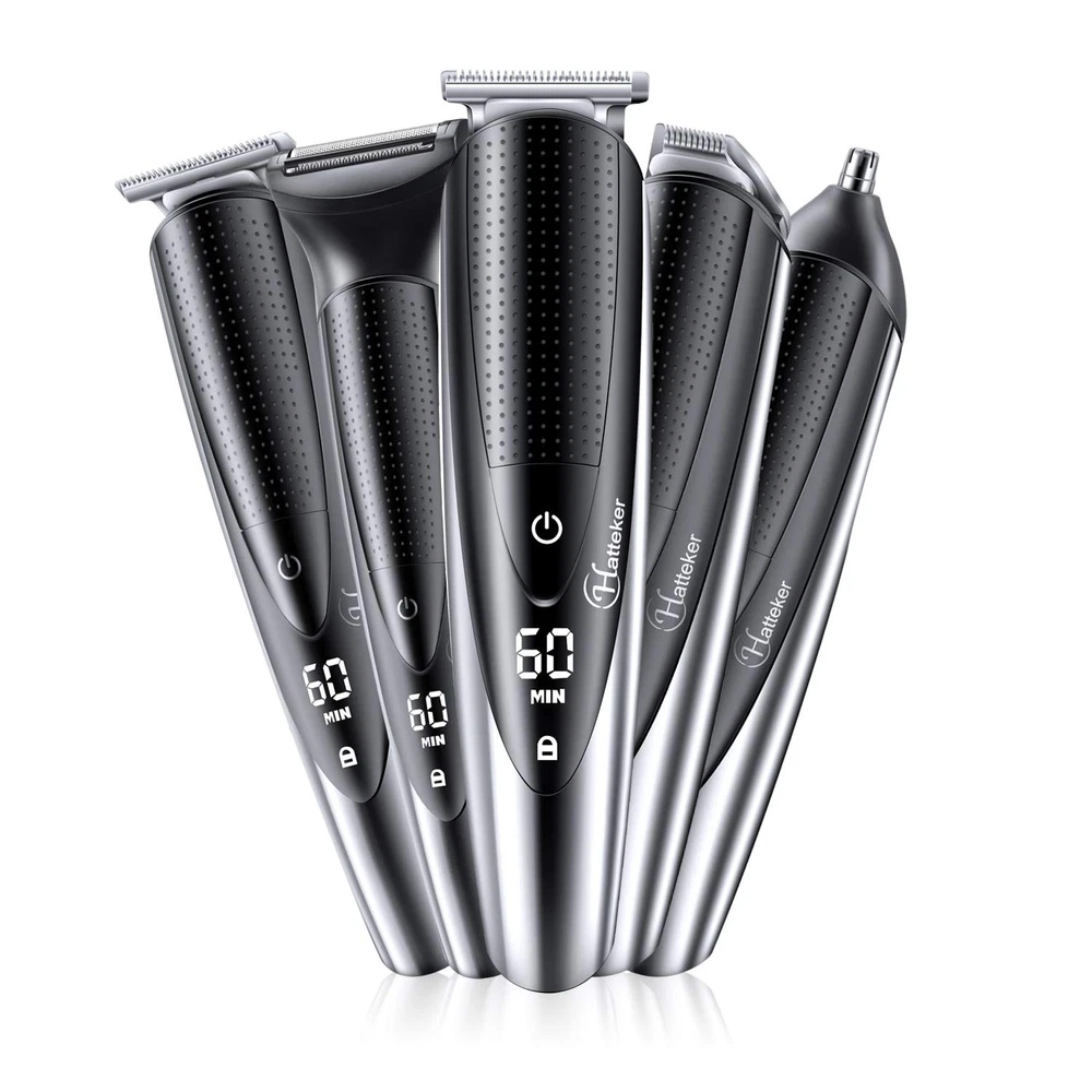 Thirteen attachments for all of your grooming needs: A full size steel trimmer, extra-wide hair trimmer, a steel precision trimmer, a nose and ear hair trimmer, a body trimmer, a adjustable beard trimmer comb (3/4/5/6 mm), a precison dial, four hair trimmer combs(3/6/9/12 mm), a adjustable comb(1/2/4/6/8/10/12/14/16 mm) for a precision trimmer, a styling comb Self-sharpening steel blades: The trimmer's precise steel blades create clean, straight lines and evenly trim through the thickest hair. The non-corrosive blades won't rust, preventing skin irritation Whole body washable: The trimmer and all of its attachments are fully washable, so simply rinse them under the faucet for easy cleaning Battery power: The high-powered rechargeable battery delivers 60 minutes of use per charge LCD display:Battery capacity(charging state of the battery is displayed in percent) / Lock Symbol