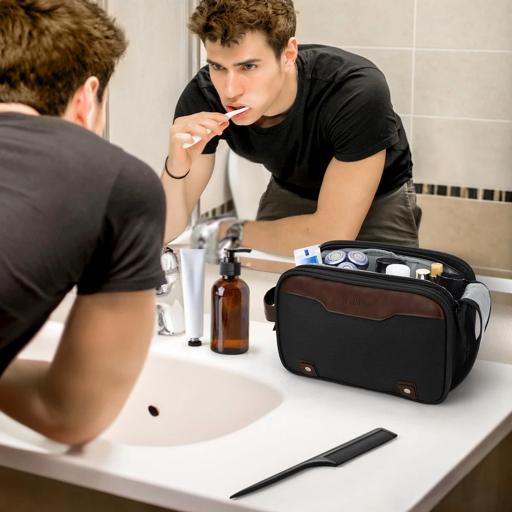 Color: Black&Brown Model: Does not apply Target Gender: Male UPC: Does not apply Package Dimensions LxWxH: 10.12x6.77x1.65 Inches Unit Count: 1.0 Closure Type: Zipper Form Factor: Rectangular Bag Weight: 0.75 Pounds Size: Medium Recommended Uses For Product: Travel Business Trips Swim Camping Toiletry Bag For Men Pattern: Solid Brand: Wedama Material Feature: Reusable MPN: Does not apply Type: Does not apply Material: Oxford, Faux Leather, Polyester Item Package Quantity: 1 Department: Men Age Range Description: Adult gtin13: Does not apply