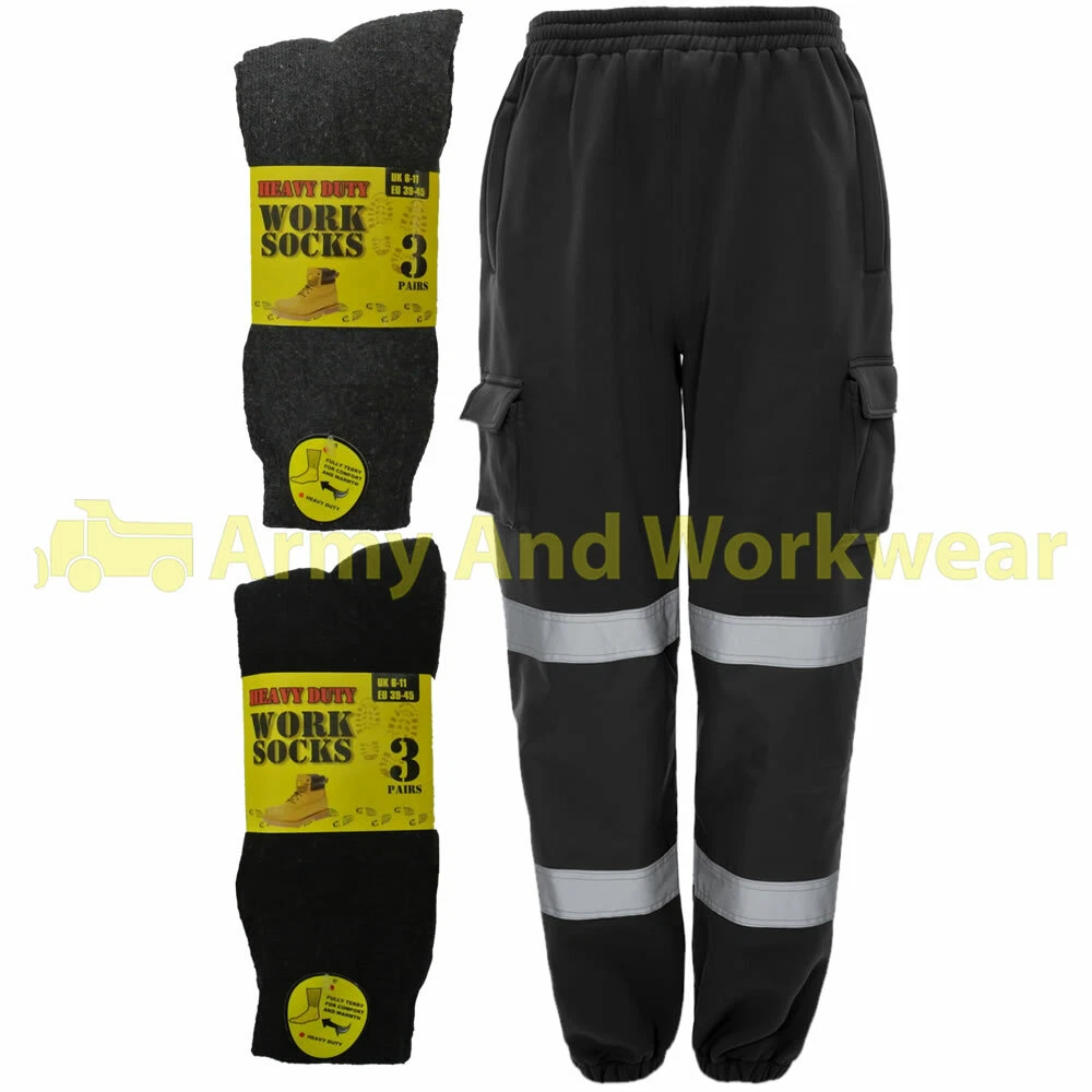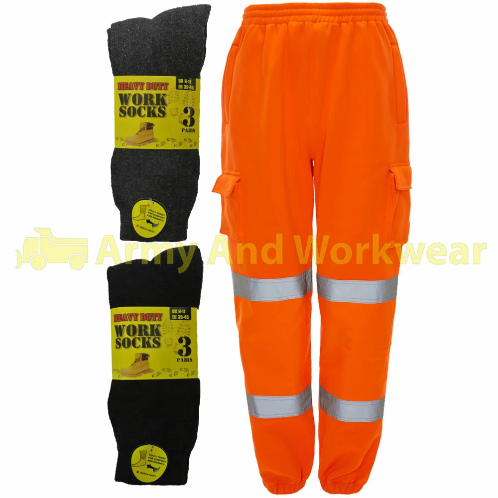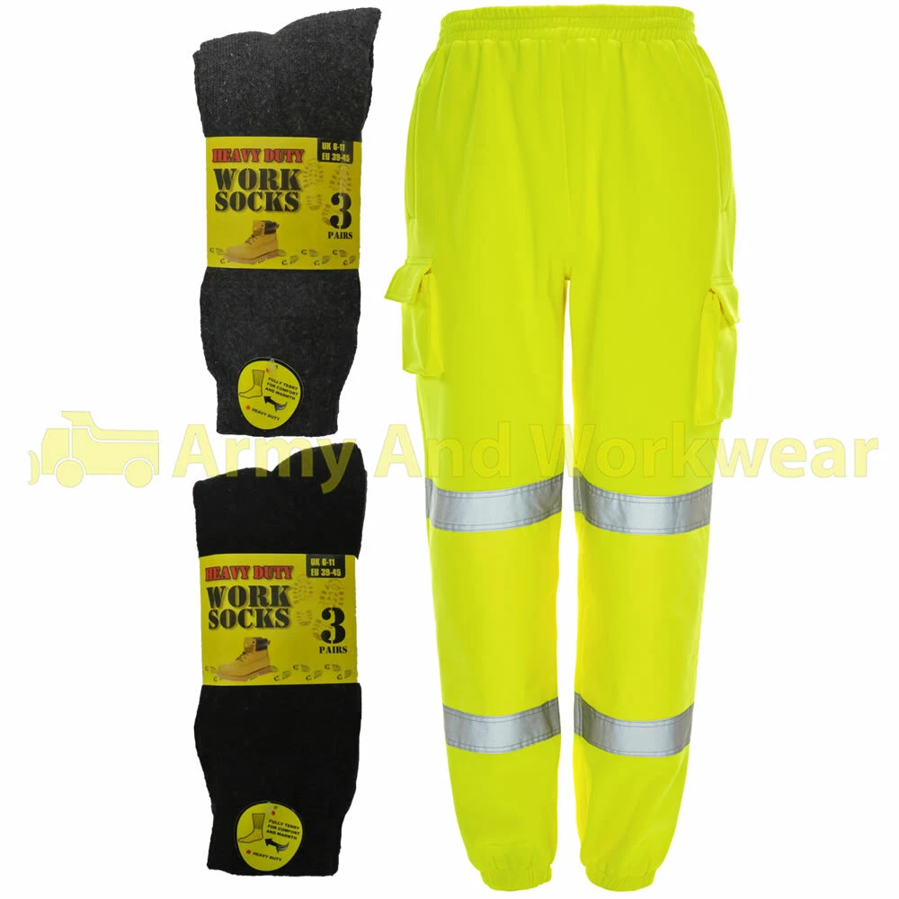 Mens Hi Viz Combat Joggers Work Jogging Bottoms Thick Fleece Safety FREE SOCKS