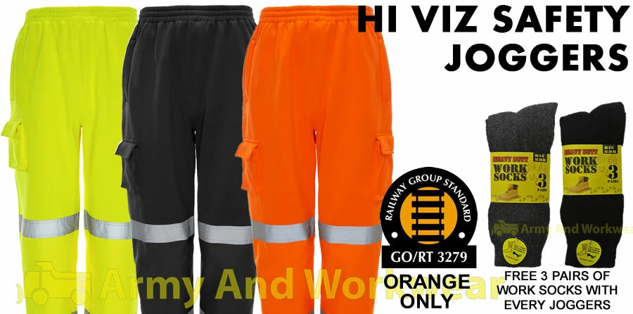 Mens High Visibility Jogging Bottoms + FREE SOCKS COLOURS Orange - GO/RT 3279 Rail Spec, EN471:2003 + A1:2007 Class 1 Yellow - EN471:2003 + A1:2007 Class 1 Black - Corporate/security colours SPEC - HI VIZ COLOURS Quality work jogging pants EC type CE approved EN471:2003 + A1:2007 Class 1 Retro reflective tape Two zipped hand warmer pockets One back pocket with Velcro flap One side phone pocket with Velcro flap One side Combat leg pocket with Velcro flap Thick elasticated waist & bottom hem Reinforced oxford fabric on knee area Fleece back sweatshirt fabric Adjustable draw cord waist 100% Polyester Condition: Brand New Machine washable Enhances your safety at nights and in low visibility situations SPEC - SECURITY COLOURS Quality work jogging pants Retro reflective tape Two zipped hand warmer pockets One back pocket with Velcro flap One side phone pocket with Velcro flap One side Combat leg pocket with Velcro flap Thick elasticated waist & bottom hem Reinforced oxford fabric on knee area Fleece back sweatshirt fabric Reinforced oxford fabric on knee area Adjustable draw cord waist 100% Polyester Condition: Brand New Machine washable Enhances your safety at nights and in low visibility situations SIZE HV Cuffed Joggers at Army and workwear SIZE WAIST INSIDE LEG LENGTH S 30 -34 30 M 32 -36 30 L 34 -38 30 XL 36 -40 30 2XL 38 -42 31 3XL 40 -44 31 High Visibility Jogging Bottoms + FREE SOCKS Orange - GO/RT 3279 Rail Spec, EN471:2003 + A1:2007 Class 1 Yellow - EN471:2003 + A1:2007 Class 1 Black - Corporate/security colours EN471:2003 + A1:2007 Class 1 One back pocket with Velcro flap One side phone pocket with Velcro flap One side Combat leg pocket with Velcro flap Thick elasticated waist & bottom hem Reinforced oxford fabric on Fleece back sweatshirt fabric Enhances your safety at nights and in low visibility situations One back pocket with Velcro flap One side phone pocket with Velcro flap One side Combat leg pocket with Velcro flap Thick elasticated waist & bottom hem Reinforced oxford fabric on Fleece back sweatshirt fabric Reinforced oxford fabric on Enhances your safety at nights and in low visibility situations HV Cuffed J