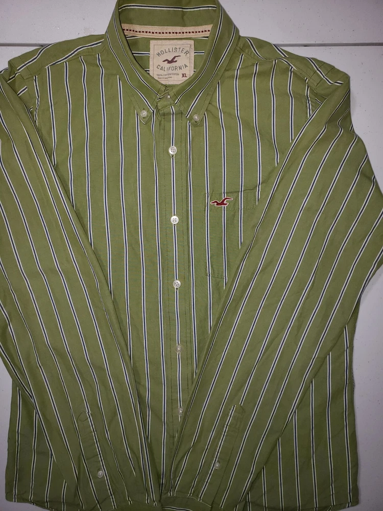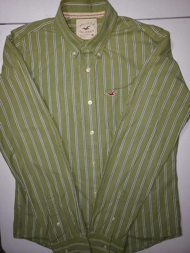 This Hollister shirt is perfect for any casual occasion. The green and blue striped pattern gives it a classic look, while the embroidered accents add a touch of sophistication. The long sleeves and collared neckline make it suitable for all seasons, and the button closure ensures a comfortable fit. Made of soft and durable cotton knit fabric, this shirt is both stylish and practical. The XL size and regular fit make it a great choice for men, and the pockets add convenience. Whether you're dressing up or down, this shirt is a versatile addition to any wardrobe. Measurements 22 inches armpit to armpit 29 inches collar to bottom Will ship by usps upon receipt of payment, usually the same day or next All offers will be considered