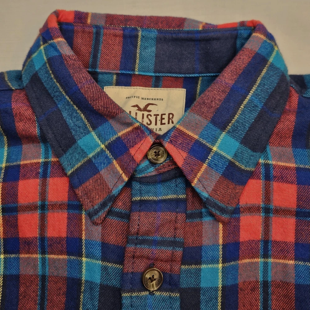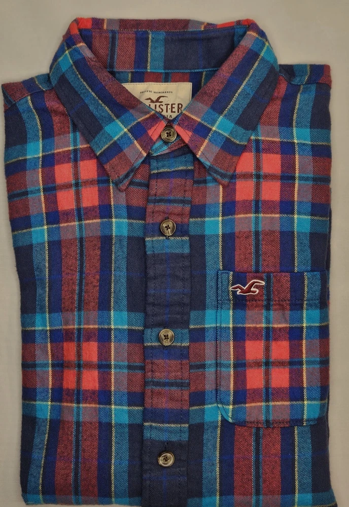 Mens Hollister Long Sleeve Plaid Soft Flannel Button Up Shirt Size Large All cotton Great looking multicolor plaid soft flannel button front shirt Pocket with logo Measures 23x30 Excellent used condition VERY NICE SHIRT FROM SMOKE FREE HOME. FAST SHIPPING WITH TRACKING INFORMATION PROVIDED.
