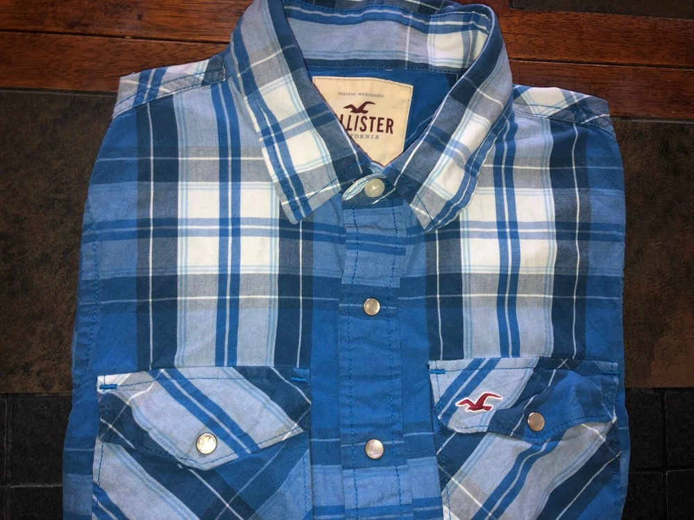 Men's Hollister long sleeve snap front Western shirt: Size Medium All cotton Blue and white plaid Two snap-down pockets Pearlized snap covers Logo on the pocket Measures approximately 22x28 Great shirt from a smoke-free home!