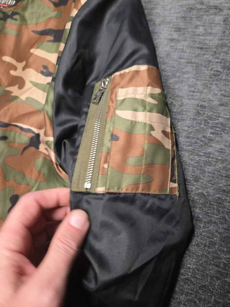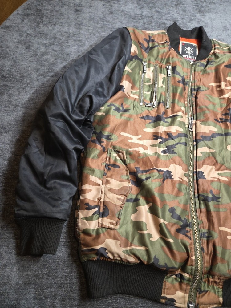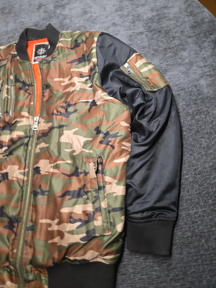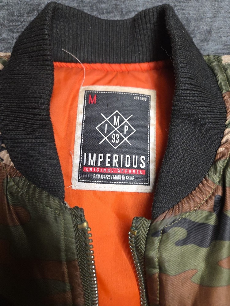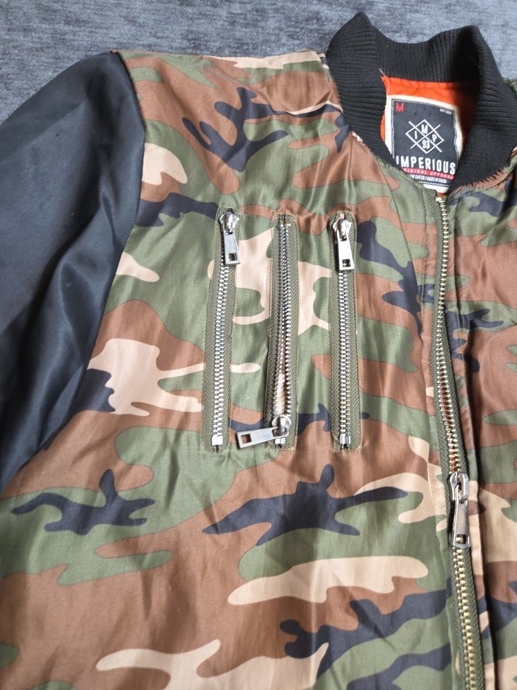 The Men's Imperious Original Apparel Camo Bomber Jacket in size M is a stylish and casual outerwear piece perfect for fall and spring seasons. Made from polyester with a polyester insulation material, this multicolored jacket features a zipper accent and is machine washable for easy care. The bomber jacket style adds a trendy touch to the wardrobe, making it suitable for walking activities. With a regular fit and no vintage design, this jacket from the brand Imperious is a practical and fashionable choice for men. 275