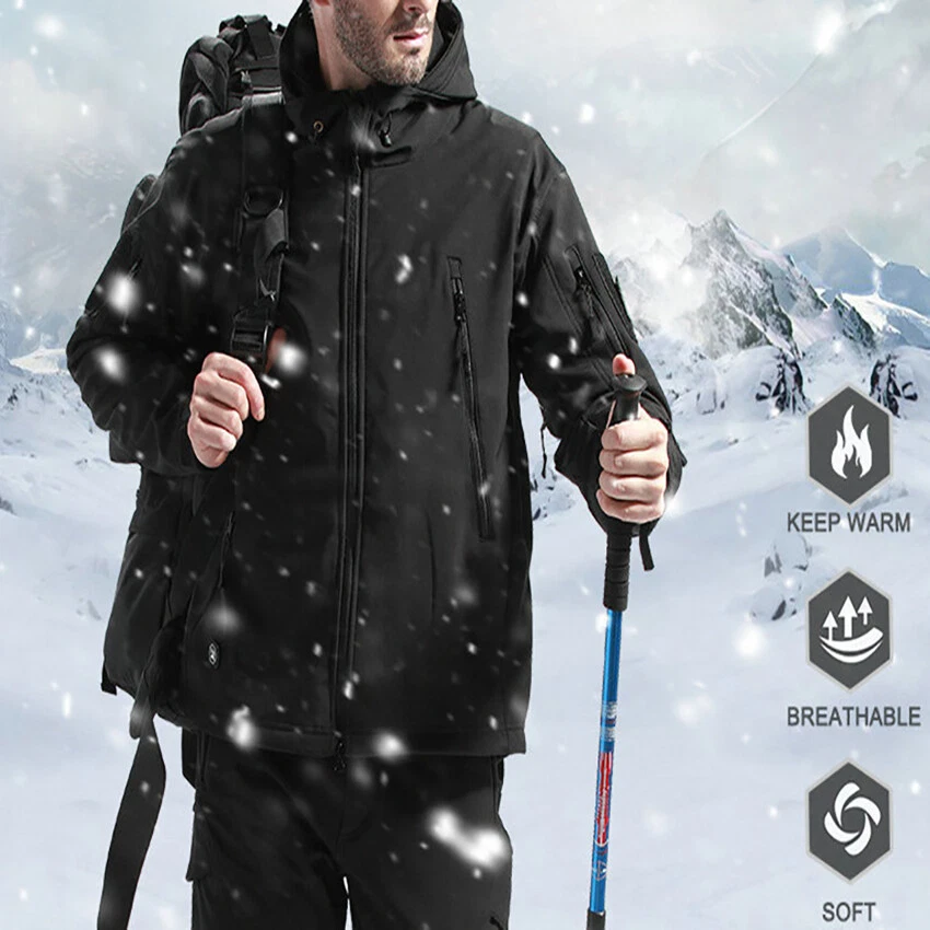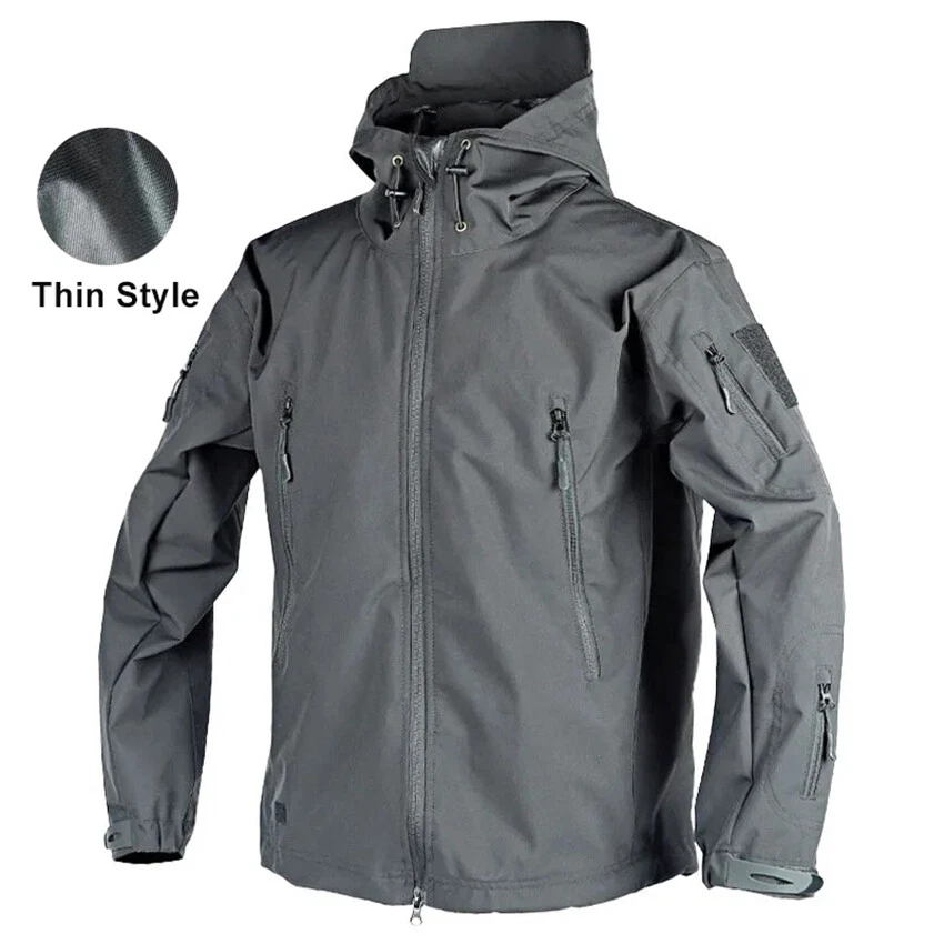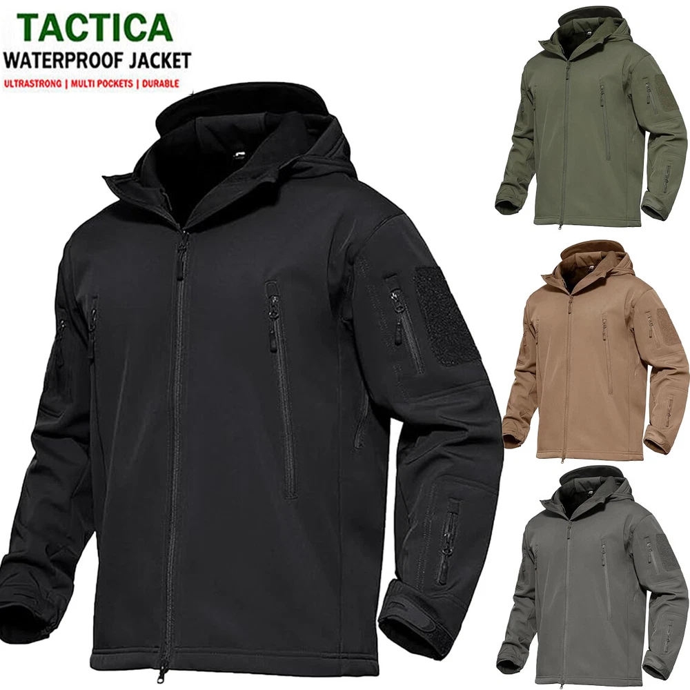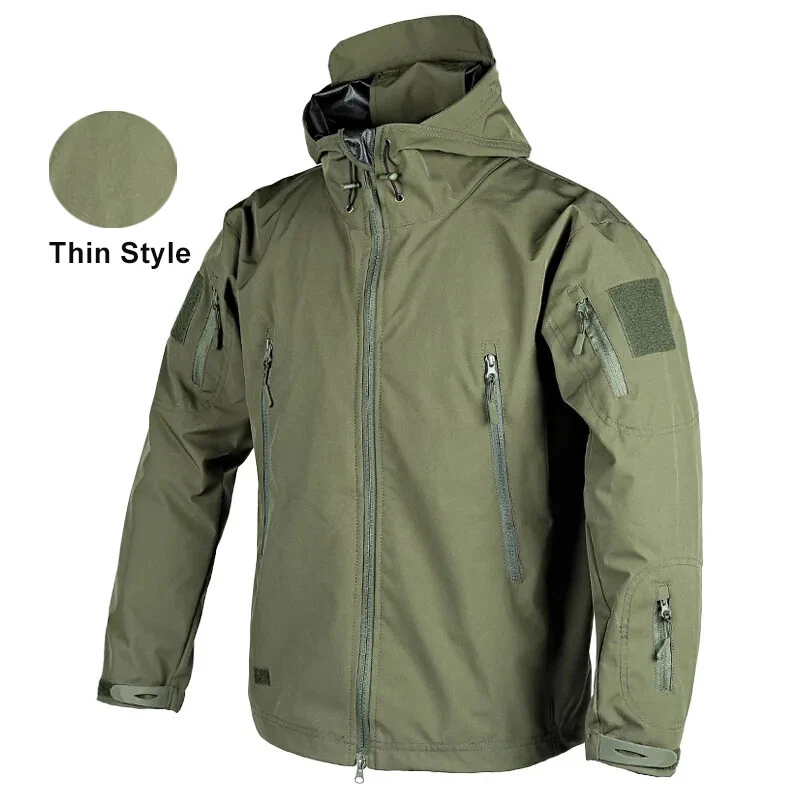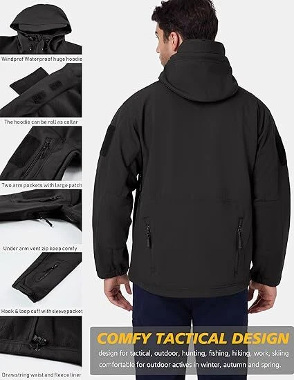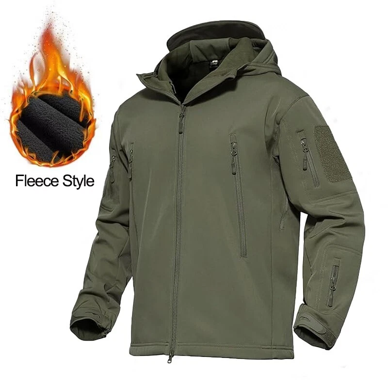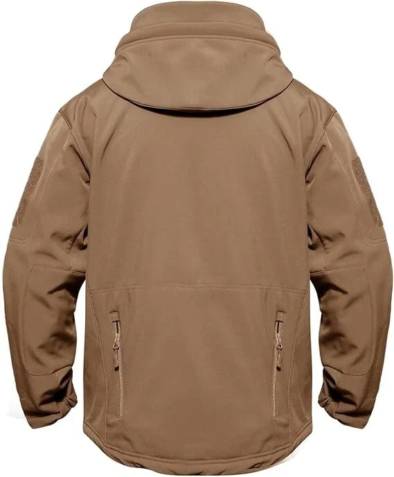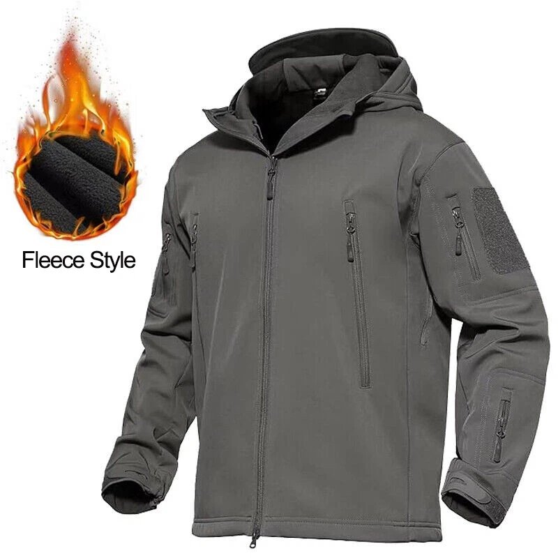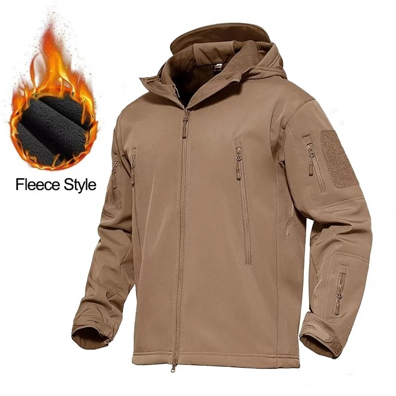 Product Description Classic tactical jacket, comfortable for all outdoor activities. it can keep you dry in the small rain and snow, also block all wind and keep the cold air out. Flexible & Multi-function. 100% polyester soft shell fabric, with thermal fleece liner, keep you pretty warm in winter. Waterproof & Windproof; Men's Clothes Zipper; Huge hood can be roll up; Two way zip up to open or close; Under arm vent zippers; Hook & loop adjustable wrist cuff; Drawstring waist and hood; Large loop on both arm for individuality patches. Tactical multi-Pockets design: 2 large zippered chest pockets; 2 back pockets; 2 small pockets on left arm and 1 small pockets on left sleeve. Good for winter, autumn and spring. Great for outdoor sport, hunting, fishing, hiking, climbing, camping, travelling, motorcycle, cycling, work and casual wear. Model Show Applicable scene