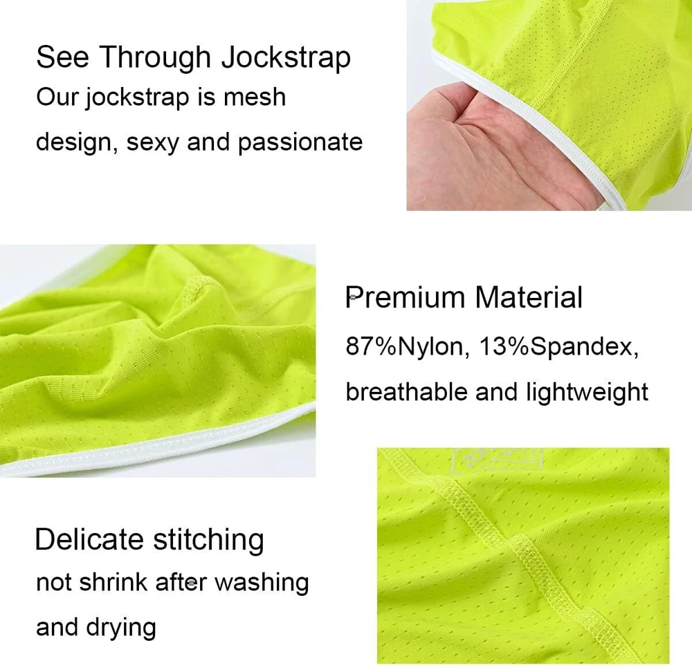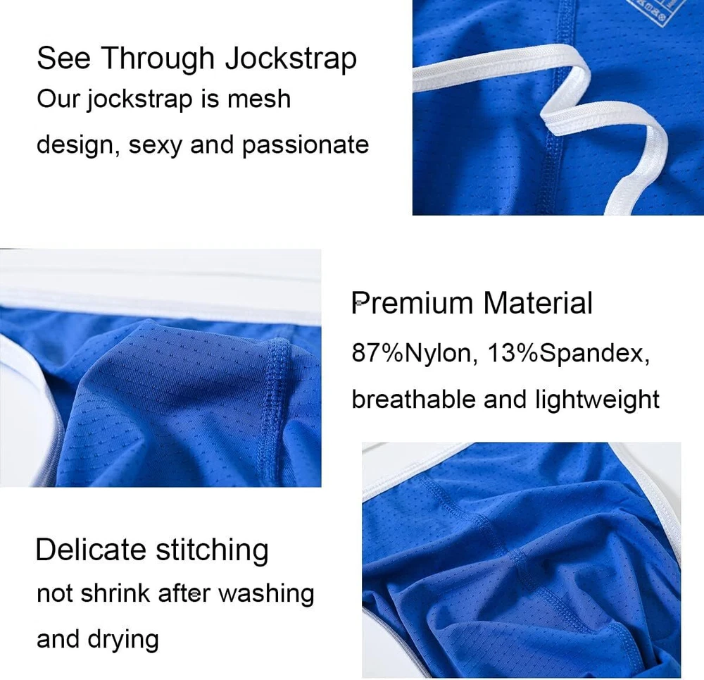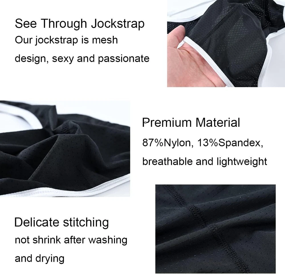 About this item MATERIALS: 87%Nylon+13%Spandex, shrink resistant, light and breathable, comfortable to wear BREATHABLE MESH BULGE POUCH: Enough space for good support, ergonomically designed to reduce constraint and chafing ELASTIC WAISTBAND: Men's jock strap briefs with stretch elastic waistband, without tightness, sliding, or rolling MOISTURE-WICKING: Men's jockstrap underwear are moisture wicking and quick drying, keep your stay cool and dry all day ATHLETIC SUPPORTERS JOCKSTRAP FOR MEN: No visible line, low rise and tagless, stays hidden underneath pants and jeans, athletic supporter for Casual, Workout, Formal suit, Sport, fitness
