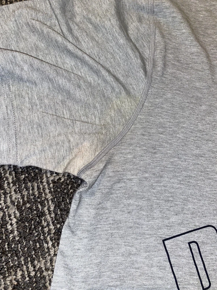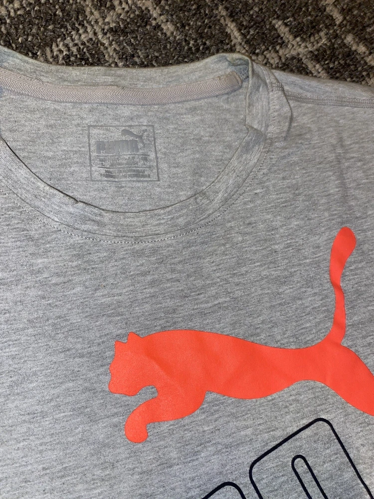Mens Large Puma T-Shirt Tee Logo Shirt Grey Athletic Shirt Sleeve. Slight discoloring jn right arm pit as photographer. Never worn though ... not sure where the discoloration came from. New