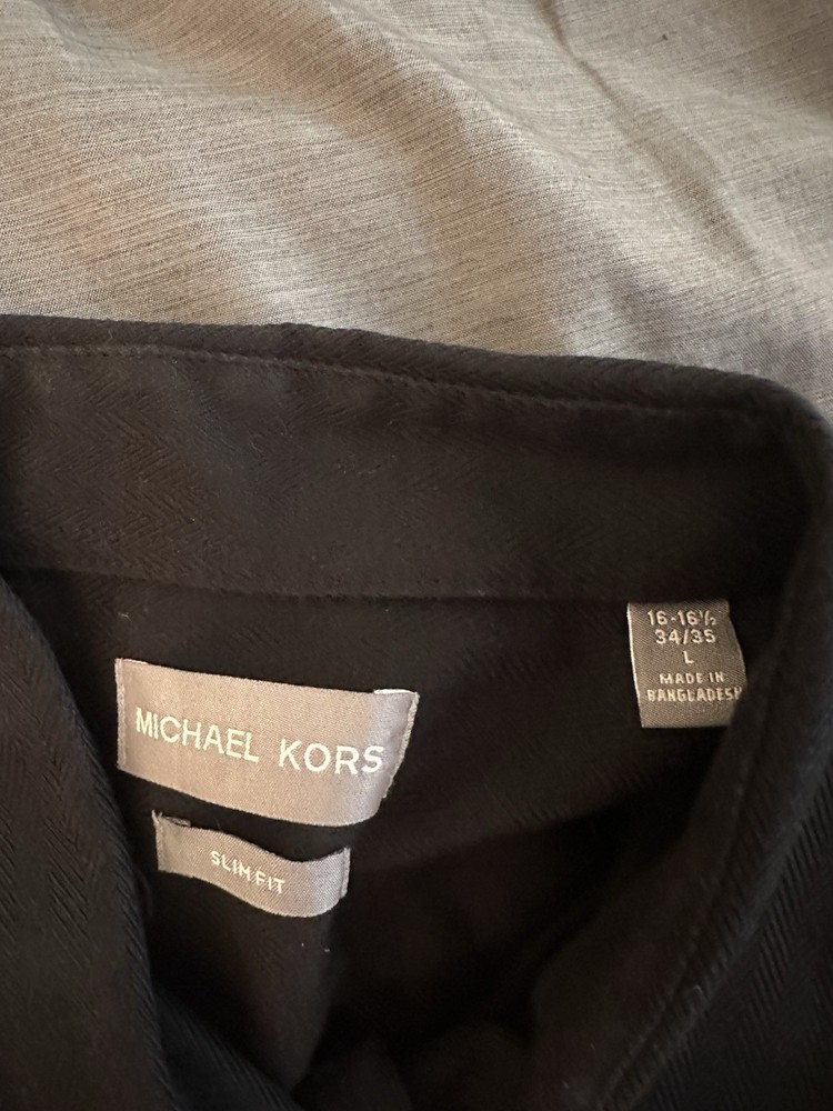 Brand: Michael Kors Size: L Accents: Button Type: Dress Shirt Top Cuff Style: Barrel Cuff Sleeve Length: Long Sleeve Features: Slimming Color: Black Personalize: No Closure: Button Theme: Designer Vintage: No Occasion: Business, Casual Handmade: No Neckline: Collared Garment Care: Machine Washable Sleeve Type: Long Sleeve Size Type: Regular Fit: Slim Department: Men