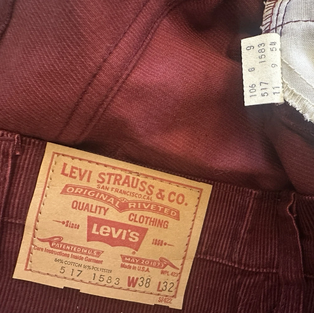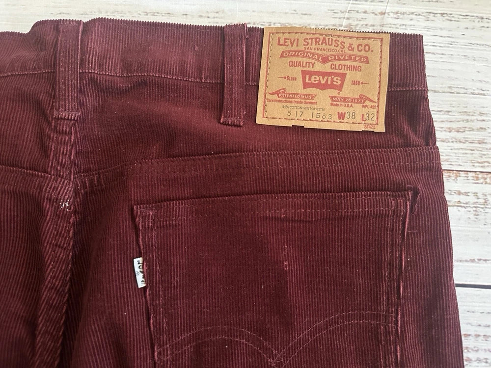 Pre-owned white tab Levi 517 jeans Please see photos and reach out with any questions Elevate your style with these classic Levi's 517 bootcut jeans in a rich wine color. Made from high-quality corduroy fabric, these jeans are perfect for a casual day out or a night on the town. With a size of 38x32, these jeans are designed to fit most men comfortably. Featuring a vintage look and feel, these jeans are perfect for any fashion-forward man who loves classic styles. The Levi's brand is known for its quality products, and these jeans are no exception. Whether you're dressing up or down, these corduroy jeans are sure to become your new favorite.