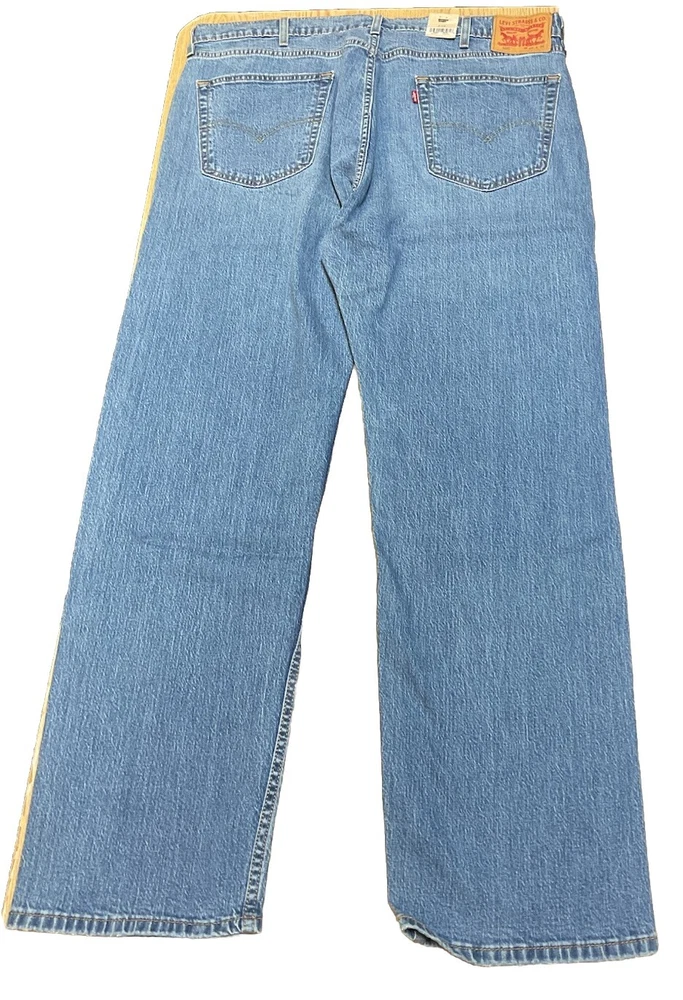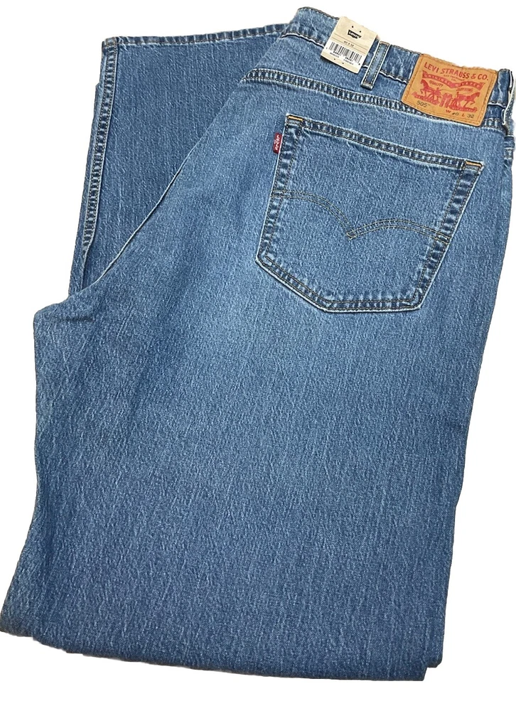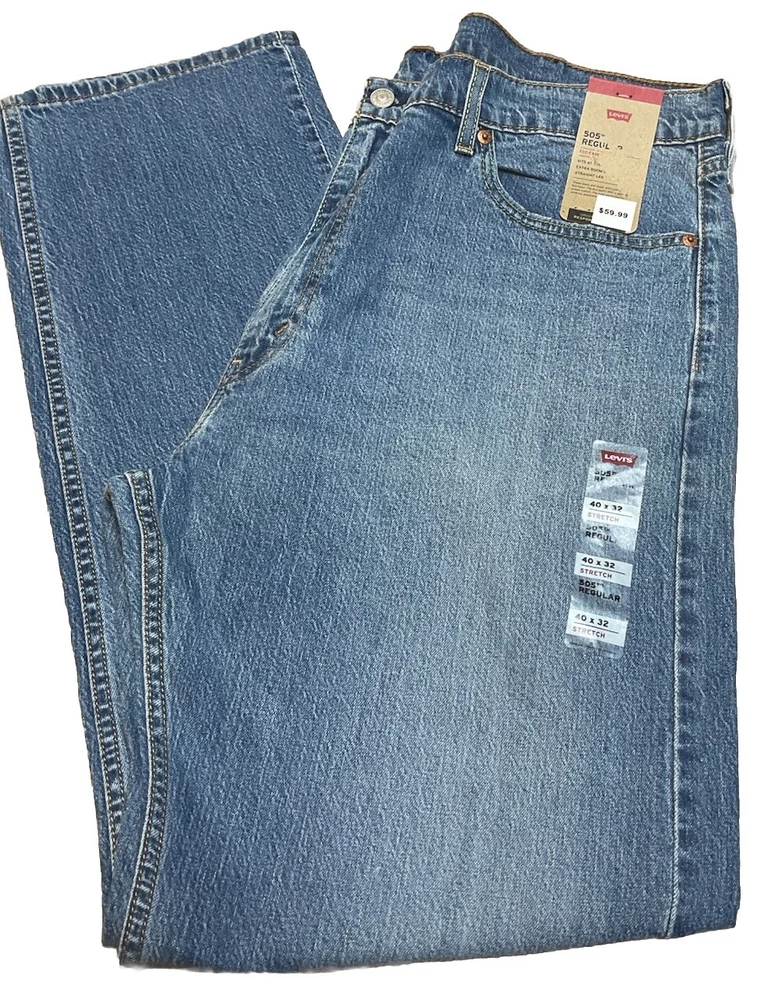 Crafted for comfort and style, these Levi's 505 Regular Eco Ease Jeans offer a timeless straight-leg fit that's ideal for everyday wear. The medium blue wash pairs effortlessly with a variety of tops and shoes, making these jeans a versatile addition to any wardrobe. With a size 40 waist and 32-inch inseam, they're designed to provide a snug fit that's both flattering and comfortable. These jeans are made from durable denim fabric with just the right amount of stretch to move with you throughout the day. They feature a classic five-pocket design and a zip fly closure, ensuring functionality without sacrificing style. The Levi's brand is synonymous with quality, making these jeans a reliable choice for years of wear.