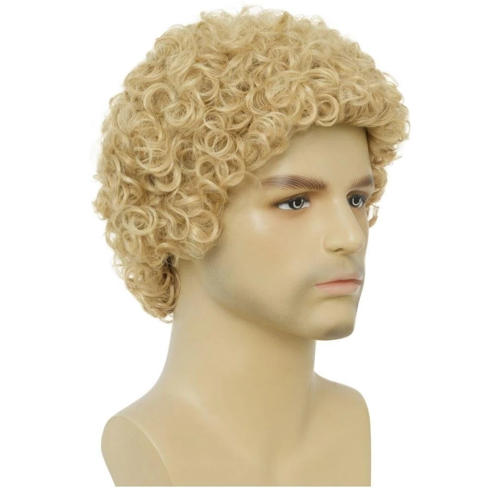 About this wig: Mens light blonde afro wig, imported heat resistant synthetic fiber, which is soft durable and charming. Color: Short blond curly wig.Looks realistic and natural perfect for carnivals,theme parties,halloween and daily use. Size: The wig cap is adjustable(21-23inch),can be intertwined to suit different head sizes. Hair Care: Just need a little mild shampoo and hair conditioner then washing in warm water. Packaged Included : 1 x wig + 1 x free wig cap.