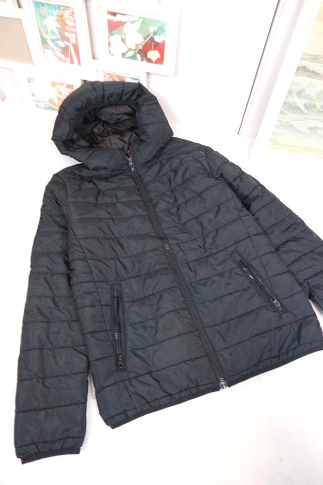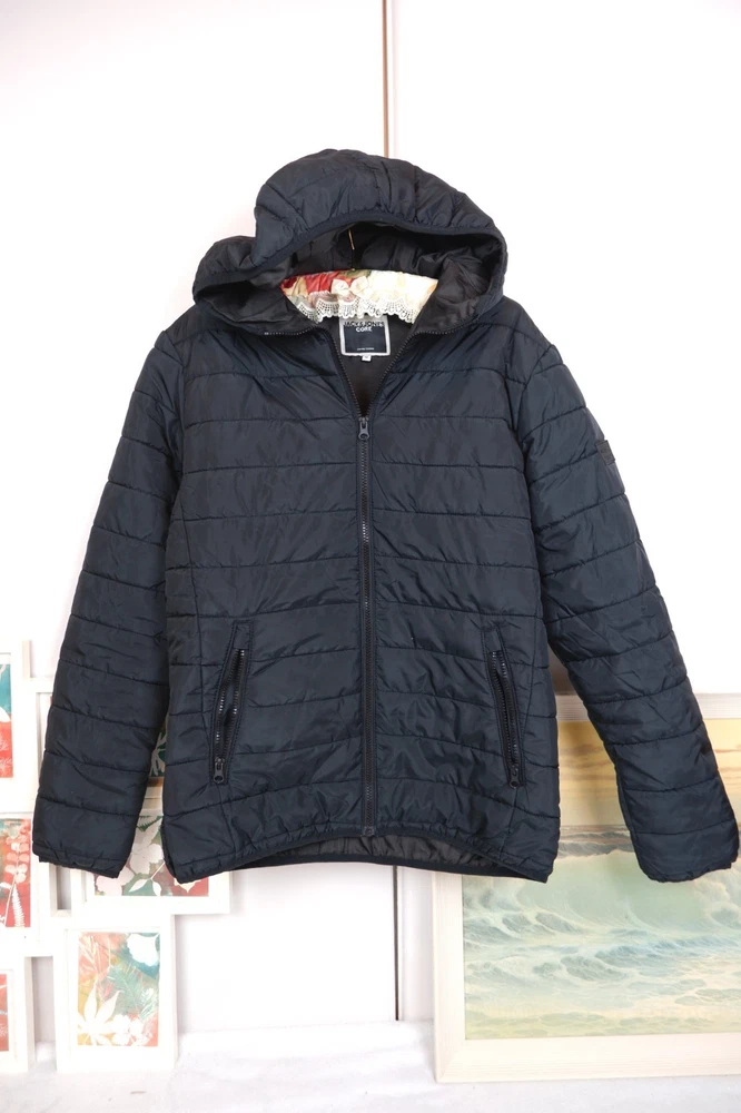 Men’s Lightweight Puffer Jacket Black Pockets padded coat hood Jack and Jones medium Very good condition Jack&Jones Size M
