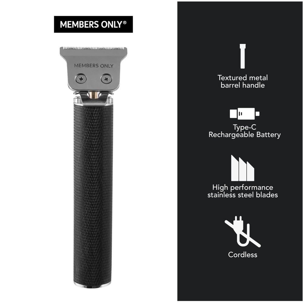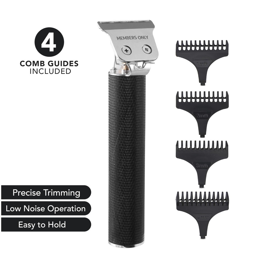 Members Only Hair Trimmer for Men, Lithium T-Blade Hair & Beard, High-Performance Stainless-Steel Blades, Close Trim Design, Type-C Rechargeable Battery, 4 Length Guards, Cleaning Brush Product Details Size: 6-Piece Brand: Members Only MPN: MO625-NOC-STK-6 UPC: 021331077257 EAN: 0021331077257 Recommended Uses For Product: Face Color: Black Hair Type: All Item Weight: 0.25 Kilograms Brand: Members Only Package Dimensions : 9.8 x 4.88 x 2.32 inches; 8.82 ounces Item model number : MO625-NOC-STK-6 Batteries : 1 Lithium Ion batteries required. (included) UPC : Manufacturer : Sakar International Superior Cutting Performance: Elevate your grooming routine with the Hair & Beard Trimmer, boasting high-performance stainless-steel blades ensuring a professional grade grooming experience, delivering precise and clean cuts for a refined look. Exceptional Extra-Close Trim Design: The T-blade is meticulously designed to provide an extra-close trim, ensuring a sharp and polished finish for both hair and beard styling, delivering results worthy of a professional salon. Versatile Length Options for Personalized Styling: Tailor your grooming to perfection with the four included length guards (1,2,3,4 mm). This set of guards offers a diverse range of styling choices for your hair and beard. Sleek and Ergonomic Design: Experience the perfect blend of style and functionality with the mens beard trimmers slim and ergonomic design. Not only does it enhance comfort during use, but it also facilitates easy maneuverability. Cordless Convenience with Long-lasting Power: The Trimmer is equipped with a Type-C rechargeable lithium battery, providing the ultimate cordless freedom. Enjoy the flexibility to groom anywhere without the hassle of tangled cords.