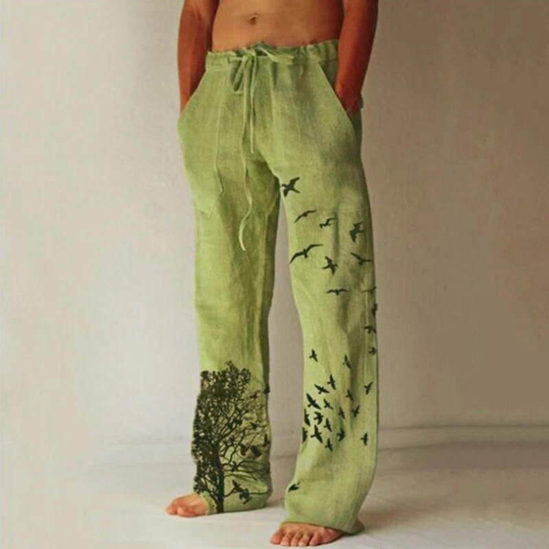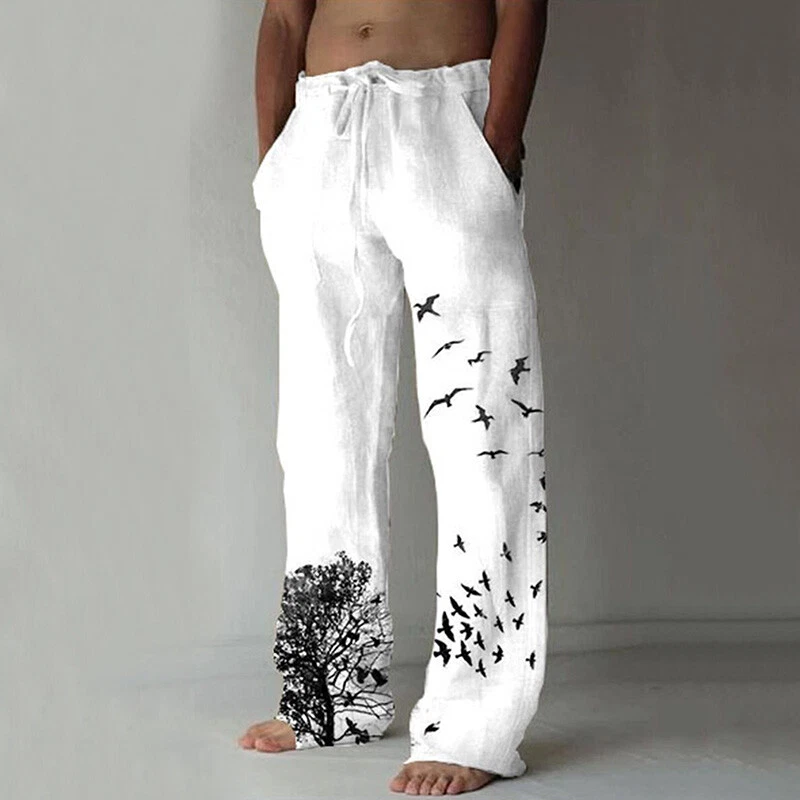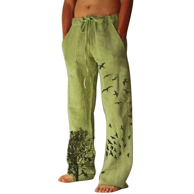 Mens Loose Hippy Long Pants Beach Scenery Printed Casual Cotton Linen Trousers Ⓡ