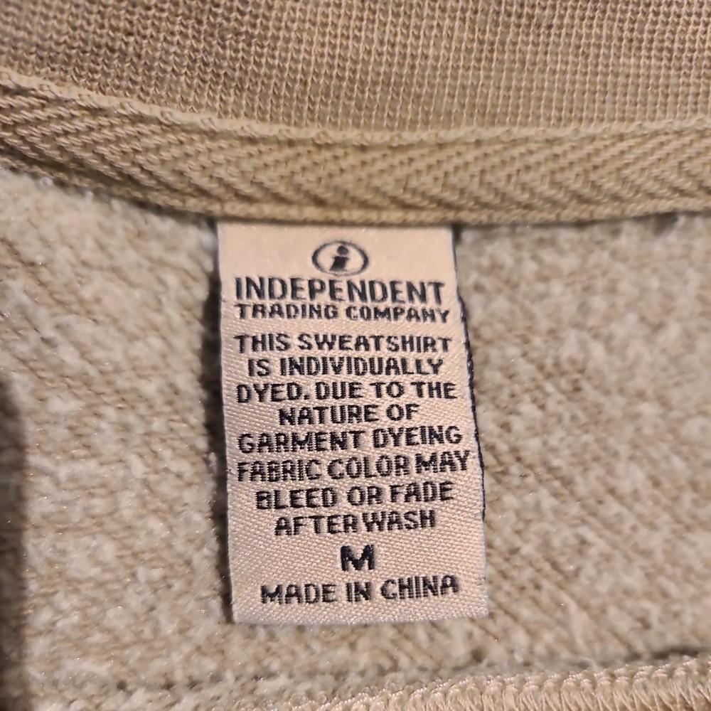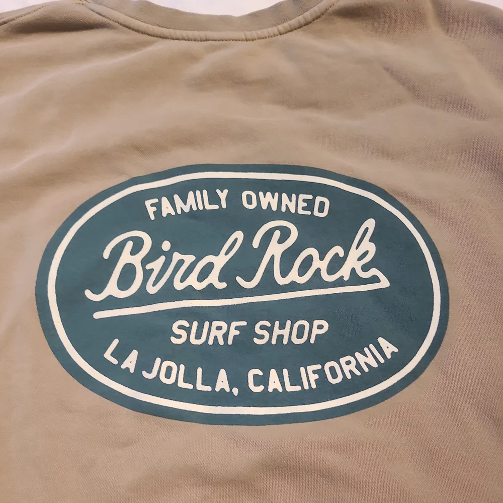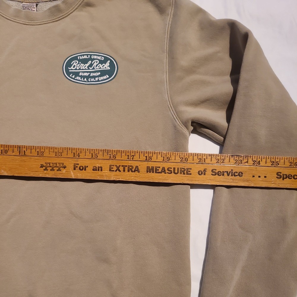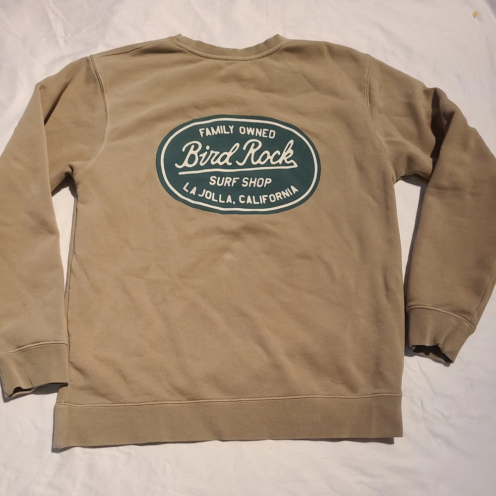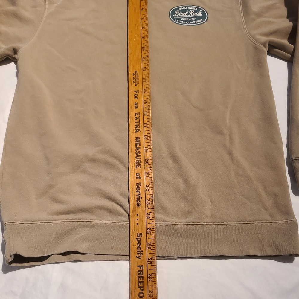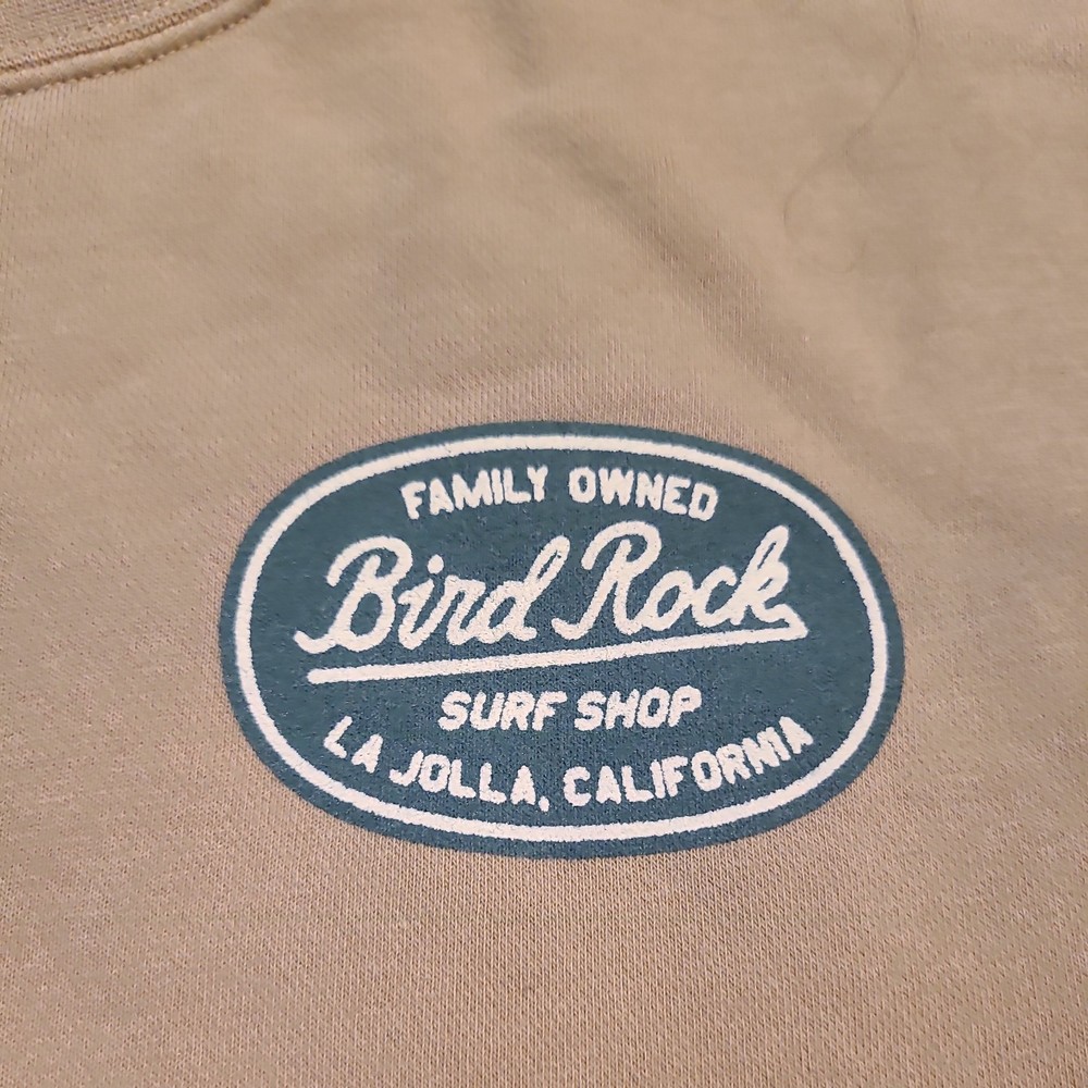 This Independent Trading Co. crewneck sweatshirt is a men's size medium in a Tan color, featuring a solid pattern with a green graphic print of BirdRock Surf Shop La Jolla, CA Made from a comfortable blend of polyester and cotton fleece fabric, it offers a cozy and lightweight feel ideal for all seasons. The pullover style with long sleeves and a crew neck design makes it suitable for various activities such as gym training, walking, dance, and CrossFit. With a versatile look that combines elements of grunge, boho, nature, hipster, school, college, outdoor, city, and sports themes, this sweatshirt is perfect for casual wear or lounging. Excellent pre-owned condition. Freshly Laundered. Stored in AC pet smoke free facility. Packed and ready to ship. Thanks for shopping by.