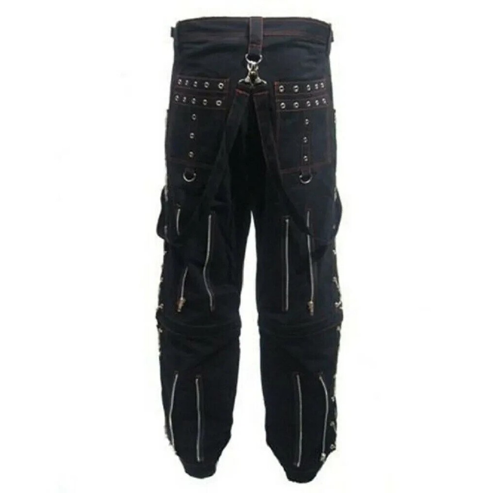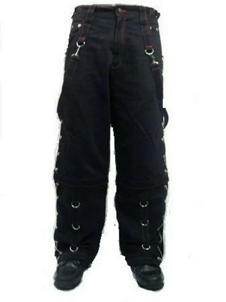 This is a pair of men's casual pants from the brand Tripp Apparel, featuring a wide-leg design with metal eyelet, studded chains, zips, and red stitching details. The pants are made of cotton material and have a solid black color with various punk and gothic-themed accents like straps, buckles, and zippers. They have a 34-inch inseam and come in size M with an adjustable waist for comfort. These handmade pants are ideal for party, casual, or formal occasions and can be styled for a variety of themed events and seasons.