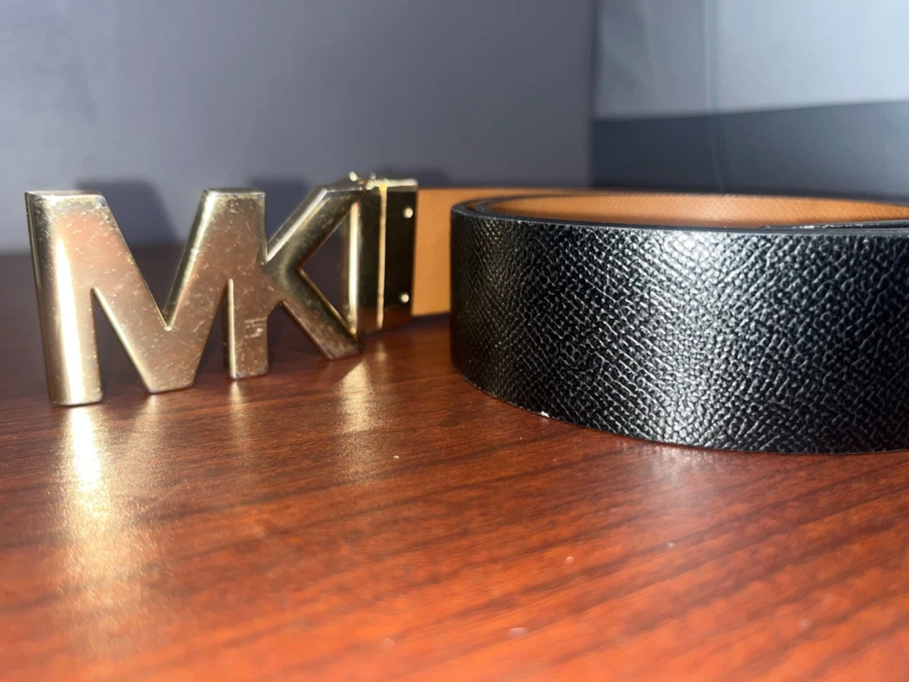 This is a men's Michael Kors belt in black or brown, featuring the brand's signature logo accents. The belt is made of leather, with a size range from 30" to 41" and a classic designer style suitable for both dressy and casual outfits. It is a preowned item with two sides, perfect for adding a touch of sophistication to any wardrobe.