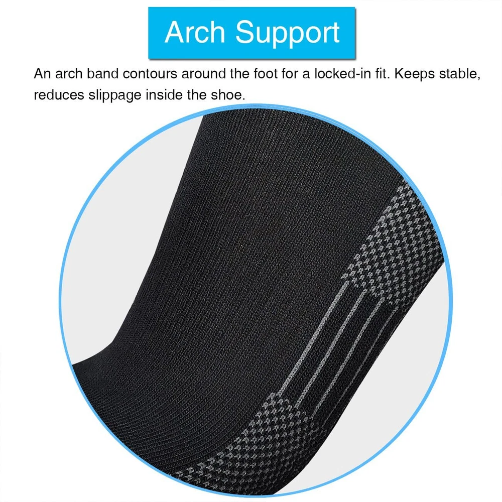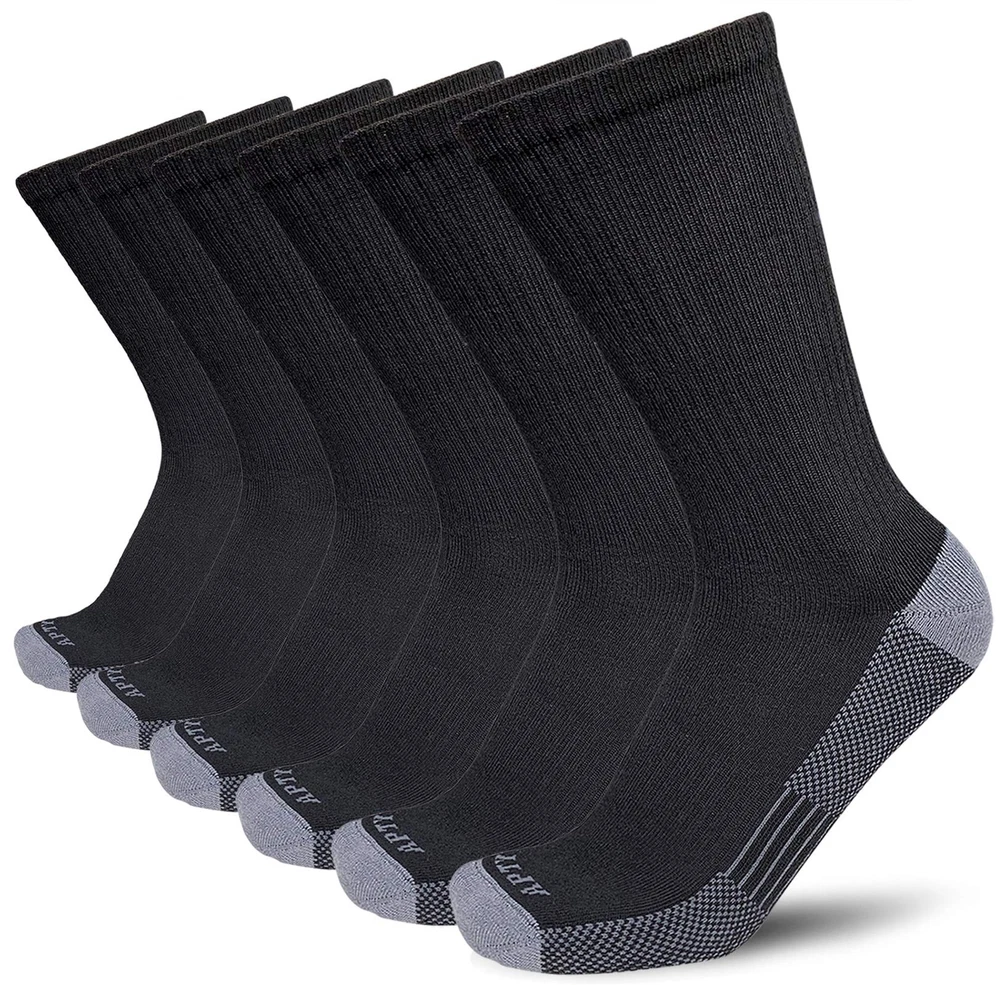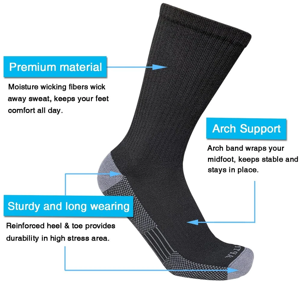 Description Men's Moisture Wicking Cushioned Crew Work Boot Socks, Size 9-12, Black, 6 Pairs For Work and Boot - The Boot Socks are soft, lightweight, breathable. Come with moisture wicking fabric that absorbs sweat to help keep feet dry and odor resistant. Cushioned Work Socks - Padded sole, just the right amount of padding for comfort, impact absorption to relieve foot pain. Sturdy & Durable - Made of strong two-strand polyester fibers, and reinforced toe and heel for durability. Reduce Swelling - Targeted compression in calf area, helps improve blood flow and reduce swelling during long standing. Dry & Fit - Good stretch, stay up and a snug fit, keep socks in place. Idear for for work boot, steel toe boot, construction, heavy duty work, military, army boot, driver, cowboy.