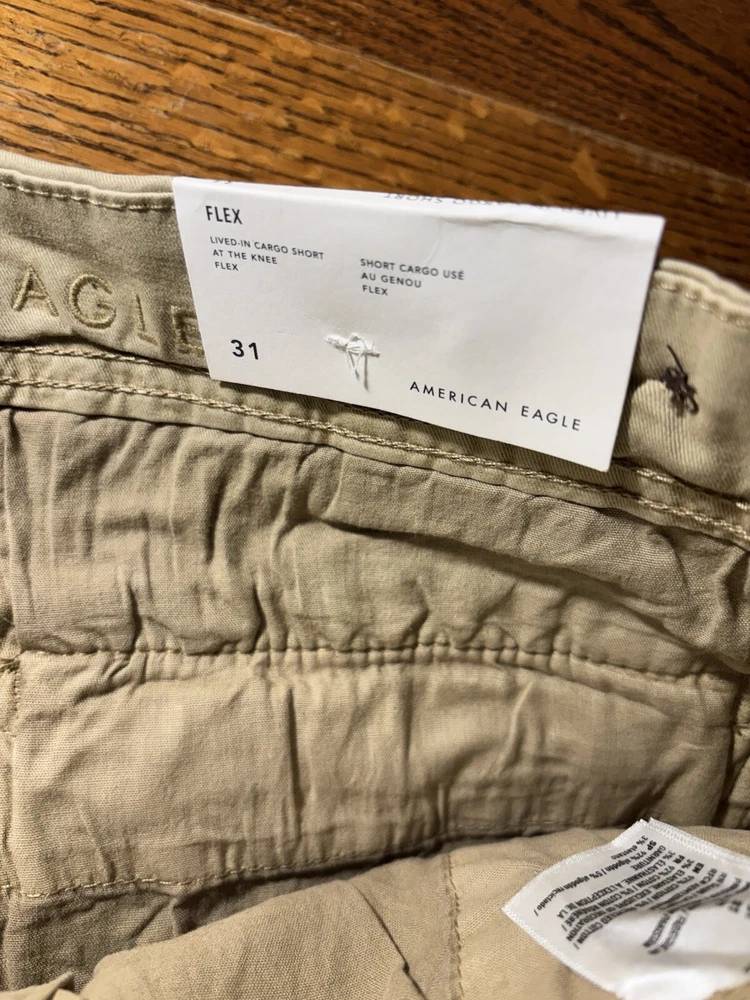 Elevate your casual wardrobe with these American Eagle Flex cargo shorts in beige. These shorts feature a solid pattern, zip closure, and flat front. The cotton and elastane material with a knit fabric type and mid-rise fit make them comfortable and stretchy. The cargo pockets provide ample space for your essentials, and the button accents add a touch of style. These shorts are machine washable, making them easy to care for. Perfect for a casual day out, these shorts are a wardrobe staple for any fashion-conscious man.