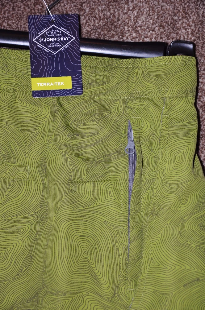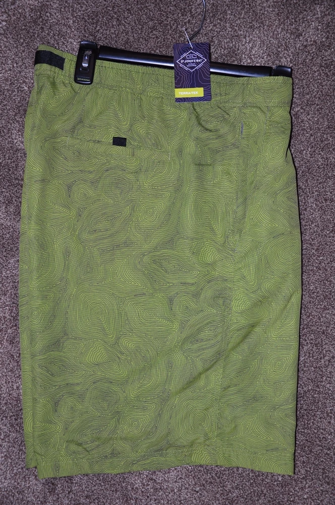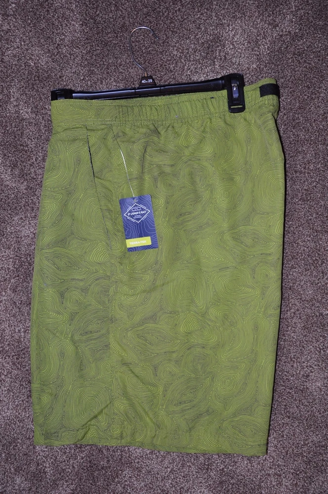 New fully lined shorts with solid front waist band with belt adjustment as as back elasticized waistband, front zipper, two front side pockets (one with zipper closure) and one back pocket (with Velcro fastener). Fabric is upf50 which protects from the sun's harmful rays! These shorts are very versatile - ideal for wearing casually doing chores or as swim trunks. Great eBay buy!!! MEASUREMENTS Waist: 42" at rest or 45" fully extended Inseam: 9" Outseam: 21 1/2"