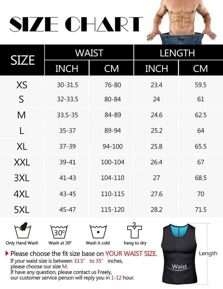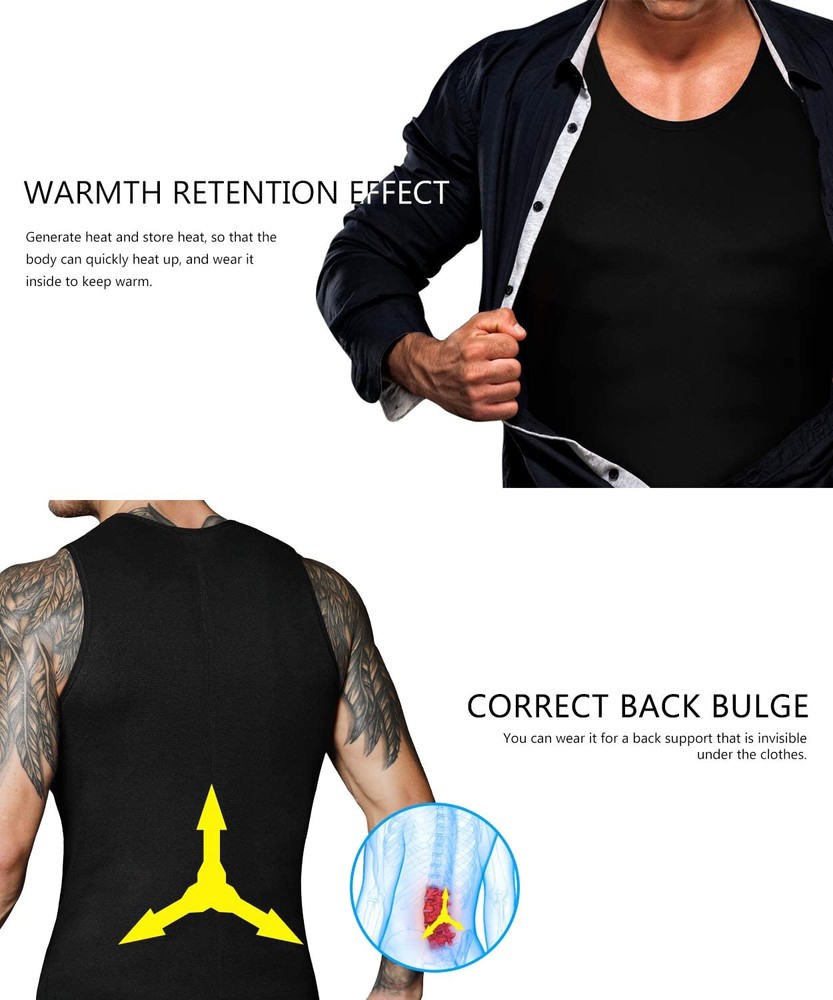 How does this sauna vest works and make you sweat like crazy, burn more fat, produce heat and weight loss: Firstly by raising your core body temperature, so your body has to work far harder to cool down and maintain a healthy temp. (this is called to thermo regulate). This process causes the body to burn off at least 50% more fat because of the extra energy (increased energy expenditure) your body uses to cool down and maintain a healthy core temperature. Secondly they cause the body to produce a heavy profuse sweat. To create sweat your body uses up massive amounts of fat and energy and burns 0.7 calories for every gram you produce. Scientific testing shows an extra 300-800kcals can be used in a workout wearing a Sweatz Quick Weight Loss Vest. This actually burns off at least twice the amount of calories and fat, accelerating your quick weight loss to a tremendous level. Thirdly they put you straight into the fat burning zone which usually takes over 30mins. So your actually burning fat for your full workout instead of just the average 20mins of a 1hr session. This makes fat burning 3 times more effiecient. Fourthly When wearing the vest your metabolic rate is increased by roughly 30% giving you an extra 30% more fat burn whilst working out. Altogether they burn off at least twice the amount of fat and make you lose weight weight twice as fast This men body shaper is very suitable for not only gym,running ,workout,exercises or any others sports, but also fit for wearing around the house, walking or working Sauna vest burn fat more than regular gym clothing,fits snuggly around your midsection,helps posture for back and abs as you workout Making you sweat crazy when you workout keeping body warm during cold days,waist trainer vest can be worn under or over your regular shirts Slimming vests with no zipper is very comfortable to wear, can burn more fat, produce heat while wearing during workout,accelerating quick weight loss Neoprene material produce higher compression leading more sweating and help your body to sweat out harmful fats and toxin. Abdominal flatten and spinal support Gym workout tank top doesn’t stink too much after prolonged use, easy clean and washable, please hang it outside to air dry