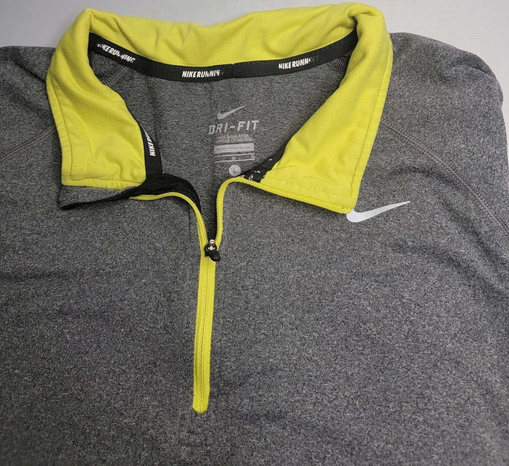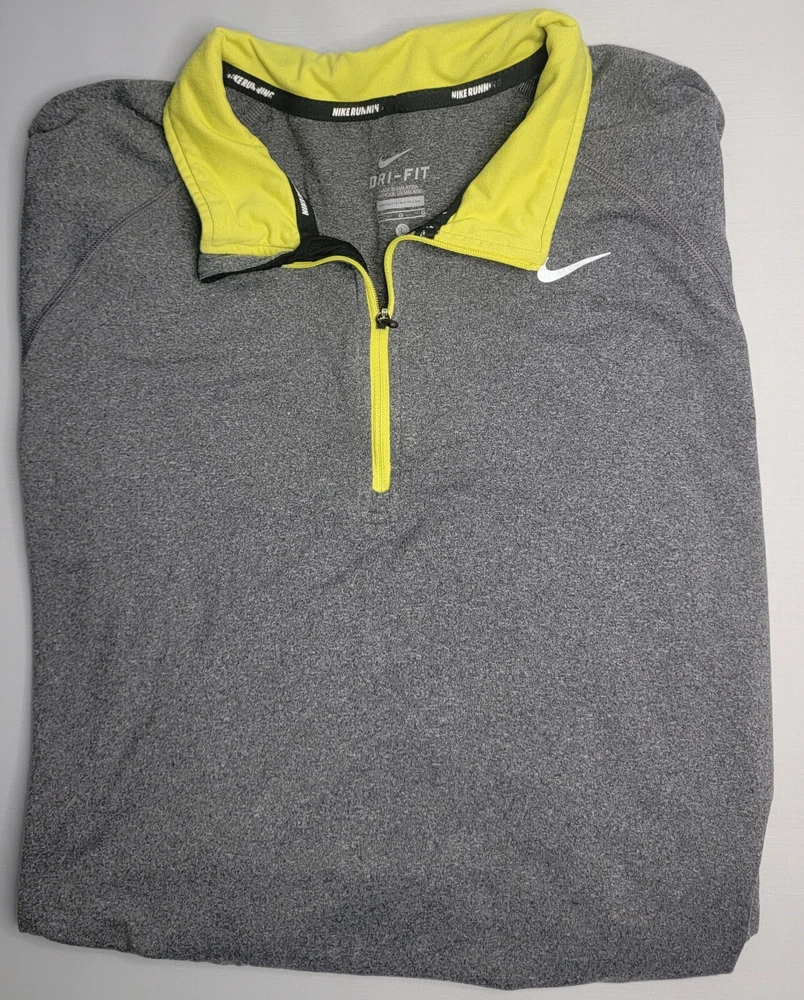 Mens Nike Dri Fit Long Sleeve 1/4 Zip Gray Athletic Shirt Large Body is 88-12 polyester/spandex blend Under arm mesh is 80-20 polyester/spandex blend Great looking gray quarter zip shirt with neon trim Nike swoosh on chest Excellent used condition VERY NICE SHIRT FROM SMOKE FREE HOME. FAST SHIPPING WITH TRACKING INFORMATION PROVIDED.