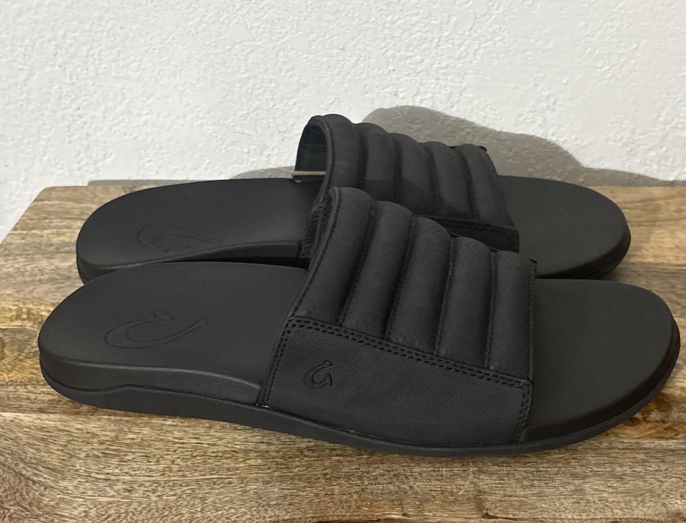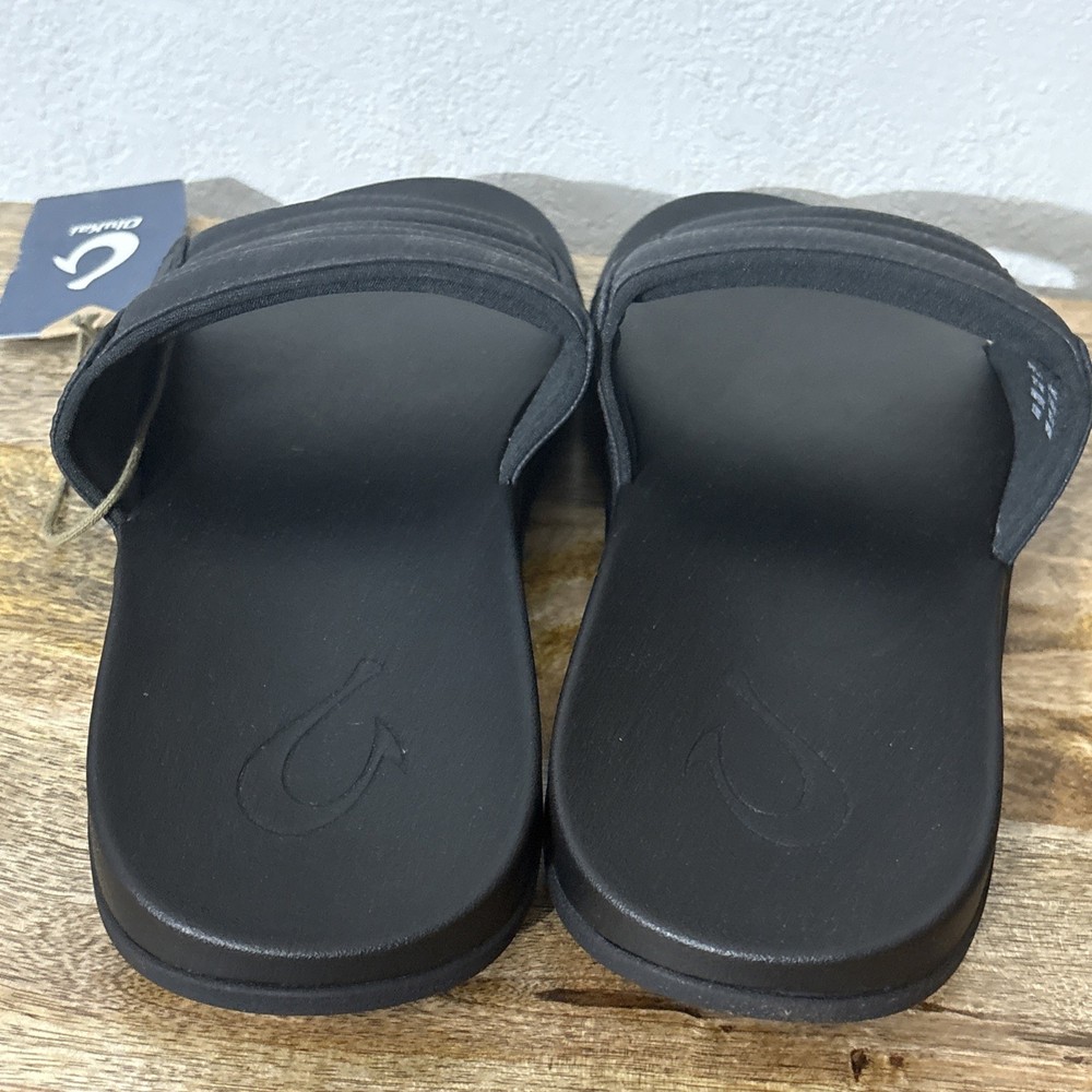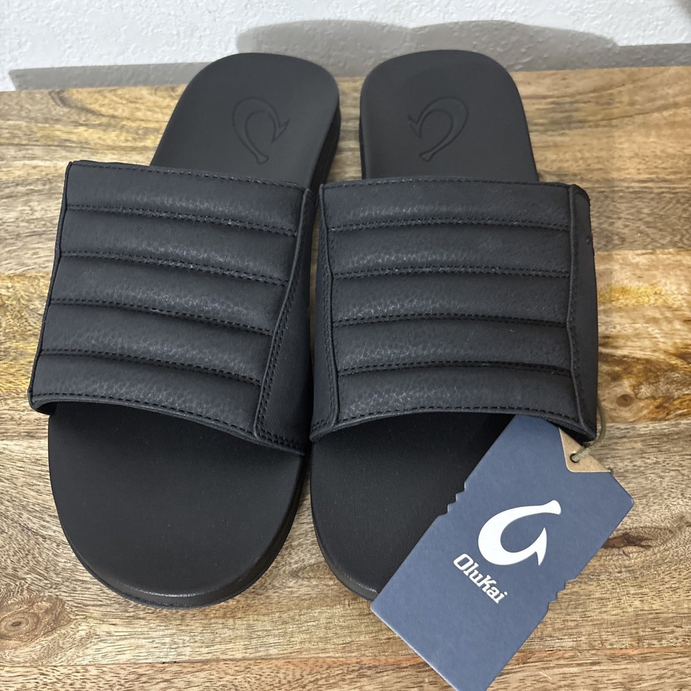 Brand new Olukai slides in six men’s 9. All black. Product highlights Designed to be your go-to recovery slide Made with water-resistant materials Extra puffy Velcro strap for a comfortable fit Oversized footbed with a super-squishy foam for instant softness and recovery Non-marking Wet Grip Rubber outsole delivers unmatched traction for sure-footed exploration. From a smoke-free home. Box S7