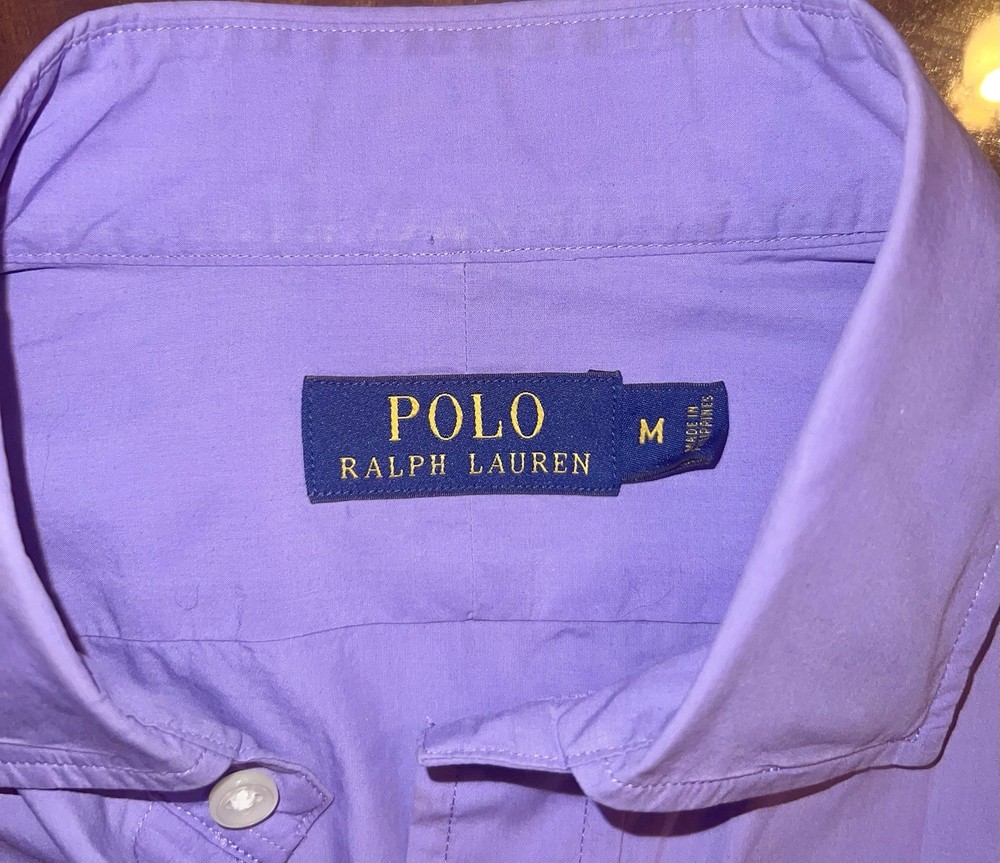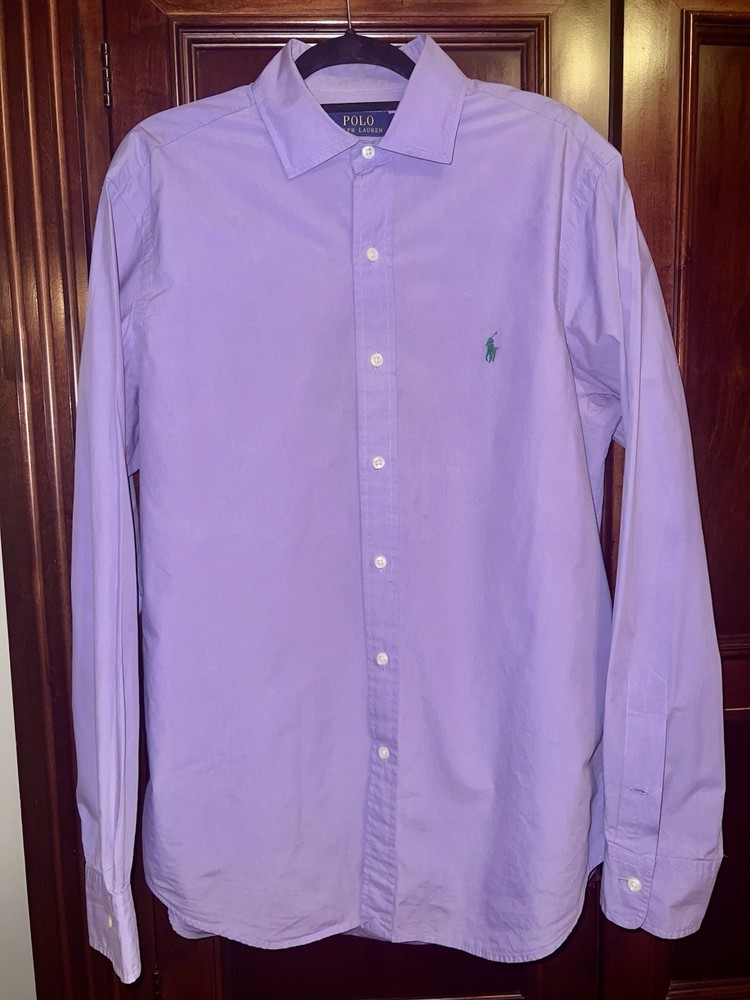 This Men's Polo Ralph Lauren Purple Dress Shirt in size Medium is a classic and versatile piece for any wardrobe. Made from 100% cotton, it features a solid pattern with a button closure and collared neckline, making it suitable for both casual and business occasions. The shirt has a regular fit and long sleeves, with a barrel cuff style for added sophistication. Machine washable and in all seasons, this shirt exudes a timeless appeal with its iconic Polo Ralph Lauren brand and button-down accent.
