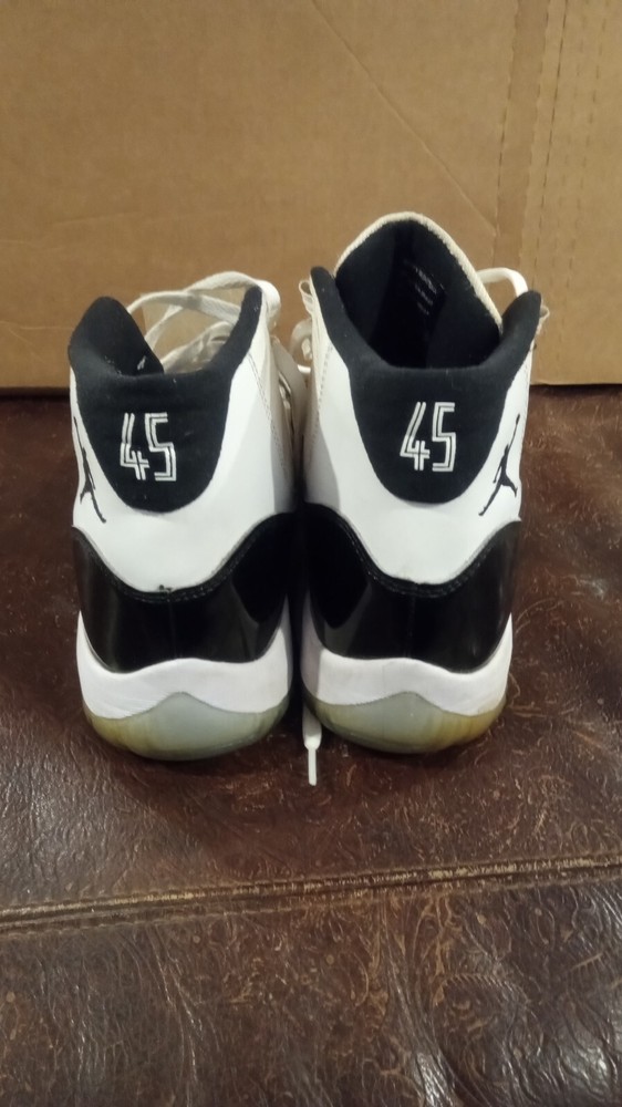 Elevate your sneaker game with these stylish and versatile Jordan 11 Retro High Concord sneakers. Designed with a lace-up closure, these shoes are perfect for any occasion, whether it's for activewear, casual wear, or workwear. The high-top shoe shaft style and solid pattern in a beautiful purple color make these sneakers a must-have for any sneakerhead. Crafted with a leather upper material and foam insole material, these shoes are built for comfort and performance. The rubber outsole material ensures durability, making them suitable for all seasons. These sneakers are perfect for basketball players and fans alike, with the Air Jordan product line and retro theme. READ SNEAKERS ARE IN USED CONDITION WITH PILLING ON THE INNER ANKLE AREA , OTHER THAN THAT THEY ARE IN VERY GOOD SHAPE.