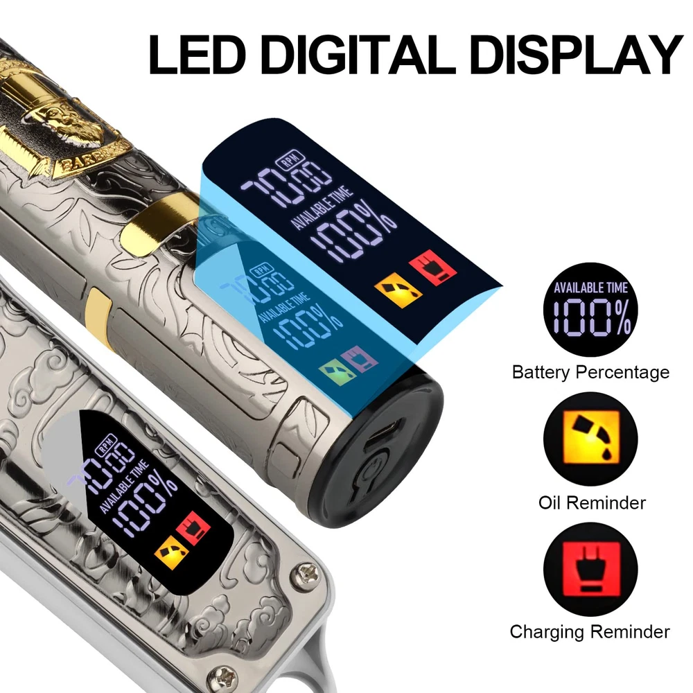 【Hair Clippers Kit for Barbers】: Our professional barber combo includes: A cordless hair clipper equipped with 8 guide combs (3/6/10/13/16/19/22/25 mm), a t liners clippers for men equipped with 6 guides (1/2/3/4/5/6 mm), lubricating oil, cleaning brush, 2 USB charging cable, and a barber's comb. 【Powerful Motor & Adjustable mens Hair Clippers】: This wireless hair clipper machine has a 10W powerful motor with a speed of 7000 RPM. The left adjustment level change adjusts 4 different cutting lengths(0.5-1.7 mm). 【Smart LED Display】: The LED displays can clearly display the remaining battery percentage, speed, fuel quantity reminder, and charging reminder. 【High Capacity Battery】The hair clippers are wireless for hair cutting built-in rechargeable 2000mAh high-quality lithium-ion battery, charged for 3 hours to provide up to 180 minutes of running time. The beard trimmer for men can run for at least 200 minutes after 2.5 hours fully charged. 【& AFTER-SALE SERVICE】We provide a year on the barber clippers professional sets. If you have anything, please directly us and we will reply to you within 24 hours.