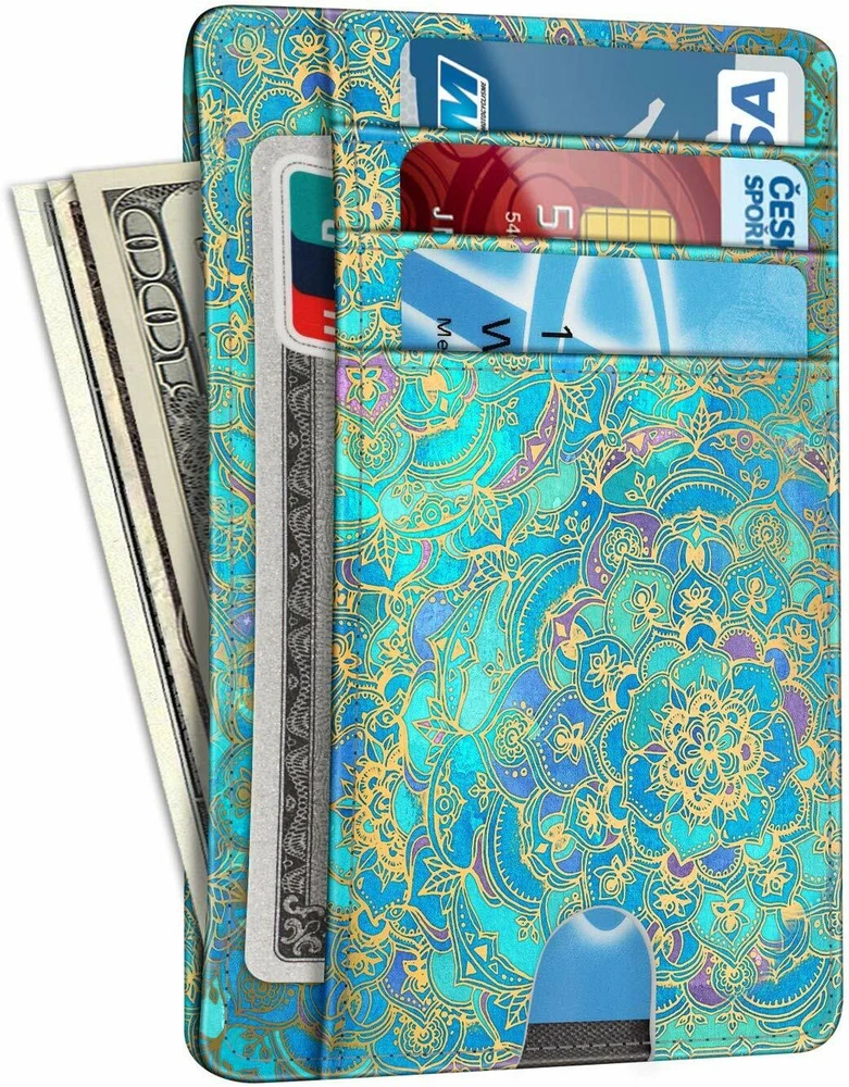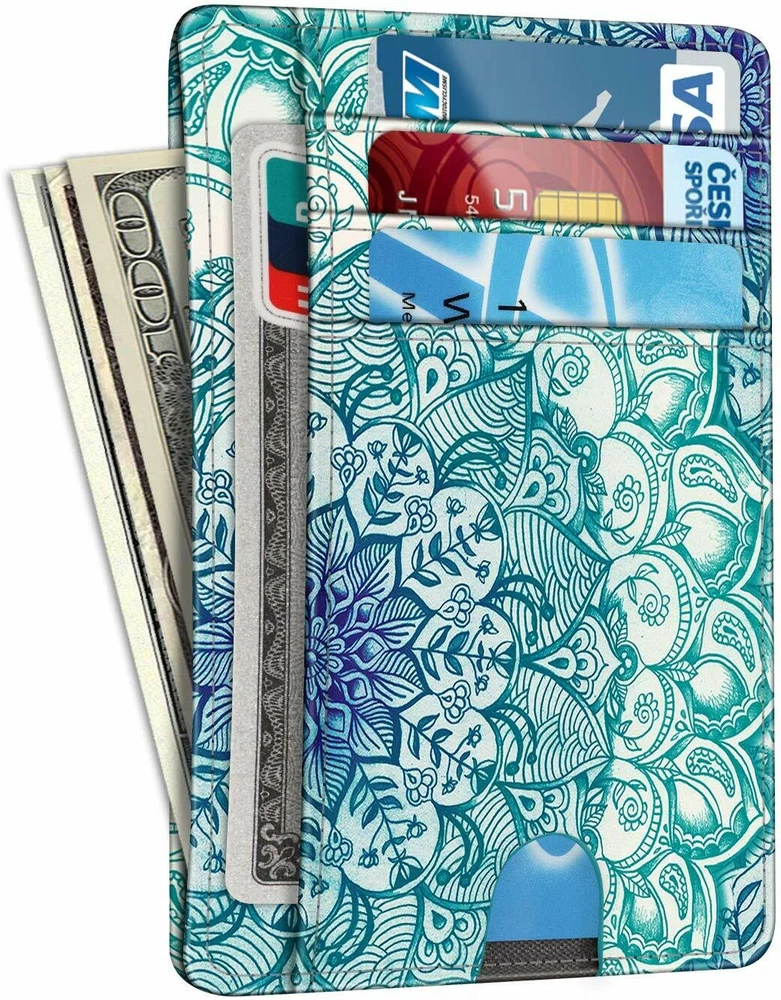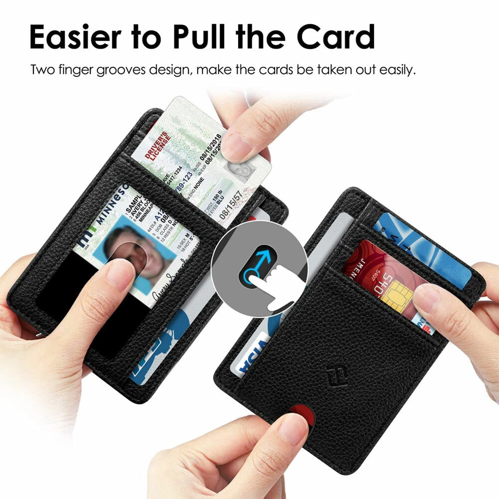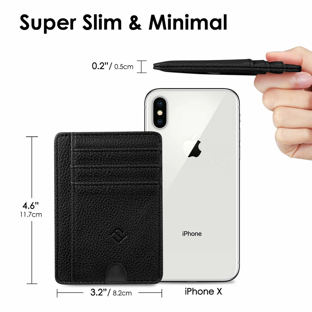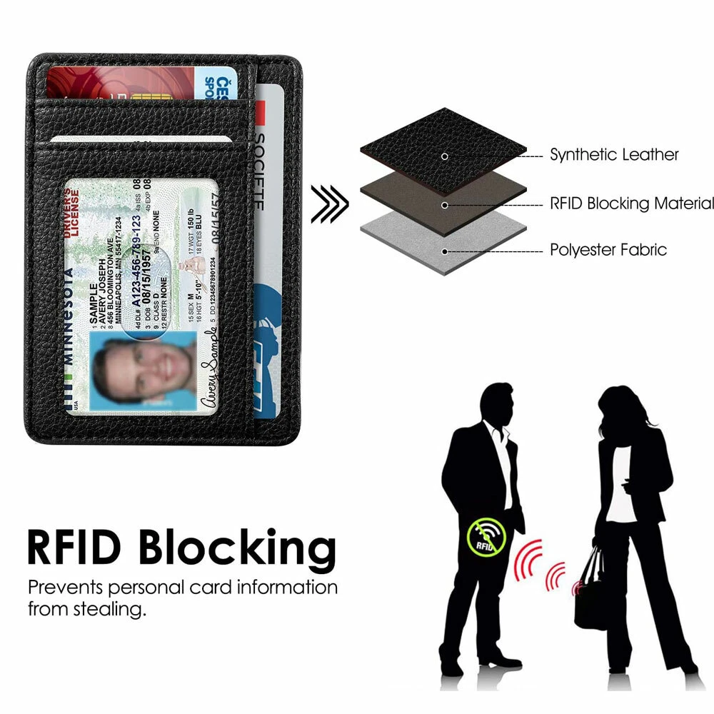 Product Description Light and Portable - Stores your carry-on essentials such as money, id cards and credit cards in a slim and lightweight front pocket wallet. Get rid of the bulky purse from now! About this item LIGHTWEIGHT & SLIM : Measuring only 4.72" x 3.35" x 0.4". It's the thin wallet that convenient to be carried around in your pocket, purse or travel pack SPACE DESIGN : It features 7 Credit card slots; 1 finger glide transparent window for ID/driving license and 1 money pocket for cash, receipt or bills EASIER TO TAKE THE CARD : Two wide card slots with thumb openings make it easier to slide the often accessed cards SECURE DESIGN : The card wallet sleeve is equipped with advanced RFID Blocking Technology; protects your valuable information stored on chips from unauthorized scans when traveling, shopping or exploring IDEAL GIFT : Built from premium composition leather - durable, sleek, functional & unisex design, is a great gift for your lover, family member or friends.