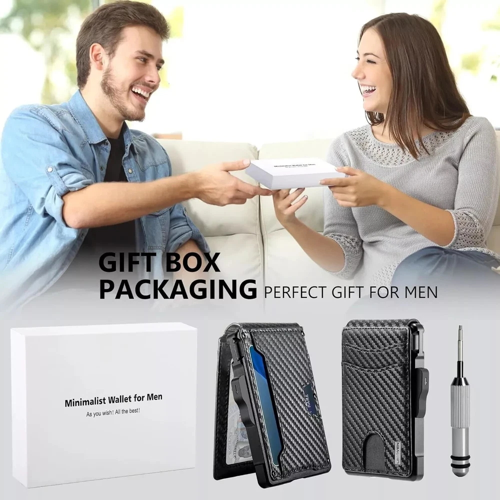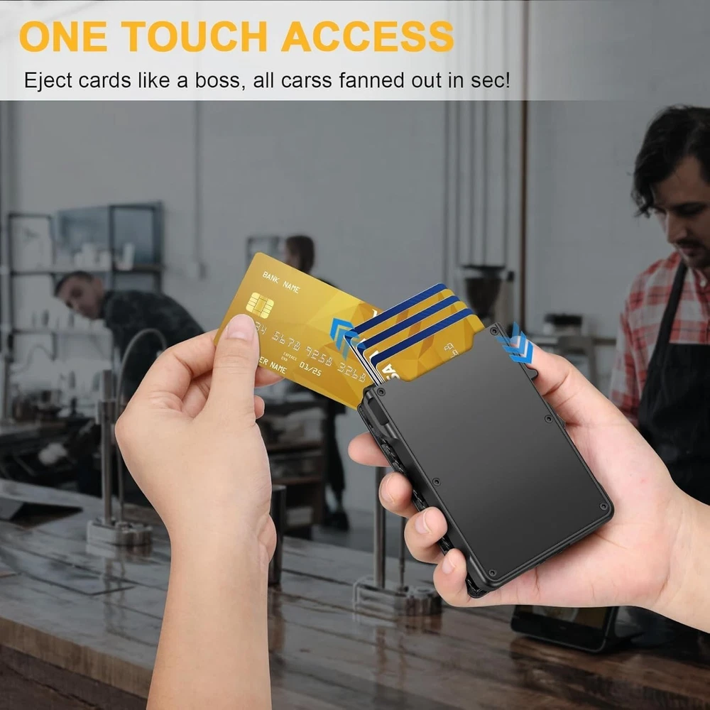 Ship from the US ,Arrive within 3-7 business days. Premium Water-Resistant PU Wallet with RFID Blocking & Aluminum Card Chamber | Holds 18 Cards + Money Clip Durable & Water-Resistant PU Cover : Crafted from high-quality PU material, this wallet is designed to withstand daily use and resist water, ensuring long-lasting durability. Smooth Pop-Up Card Access : The advanced aluminum wallet chamber features a convenient pop-up mechanism, providing easy and quick access to your cards. Magnetic Closure for Security : Equipped with a strong magnetic closure that seamlessly connects the PU cover and aluminum chamber, keeping your cards safe and secure Large Capacity & Compact Design : Slim yet functional, this wallet can store up to 18 cards, including a transparent ID window for quick access, and a built-in metal money clip for holding cash securely. RFID Blocking Technology : Protect your personal information from unauthorized scanning with built-in RFID-blocking technology, ensuring peace of mind and security. Stylish & Unisex Design : A sleek, modern wallet that suits both men and women, perfect for any occasion. Perfect Gift with Elegant Packaging : Comes in a beautifully designed gift box, making it an ideal present for birthdays, anniversaries, or any special occasion. *Shipping Information : We ship daily to ensure you receive your order as quickly as possible. * *Return Policy : Returns accepted within 30 days for a hassle-free experience. *