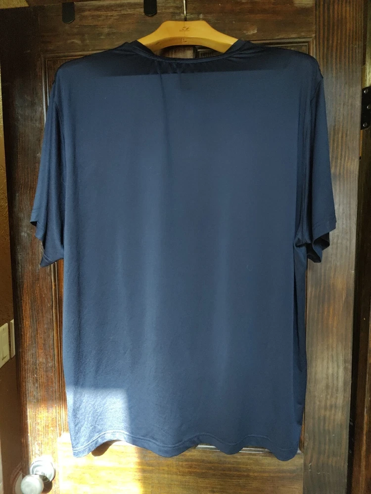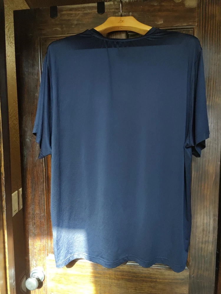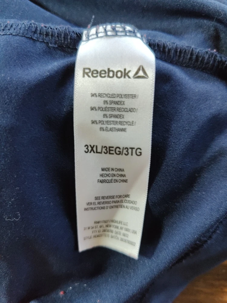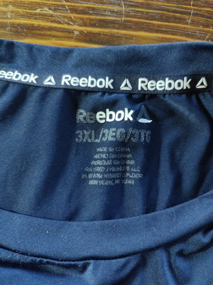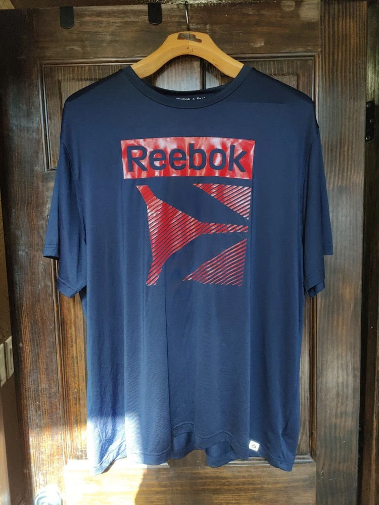 The shirt comes in a solid navy-blue color with a crew neck, 3XL and short sleeves, made from comfortable and durable polyester knit fabric. The shirt features an embroidered Reebok logo on the front, adding a touch of style and personality to any outfit. Average preowned condition showing typical signs of wear from age, use and washings. Much of the logo at the back neckline has worn off.