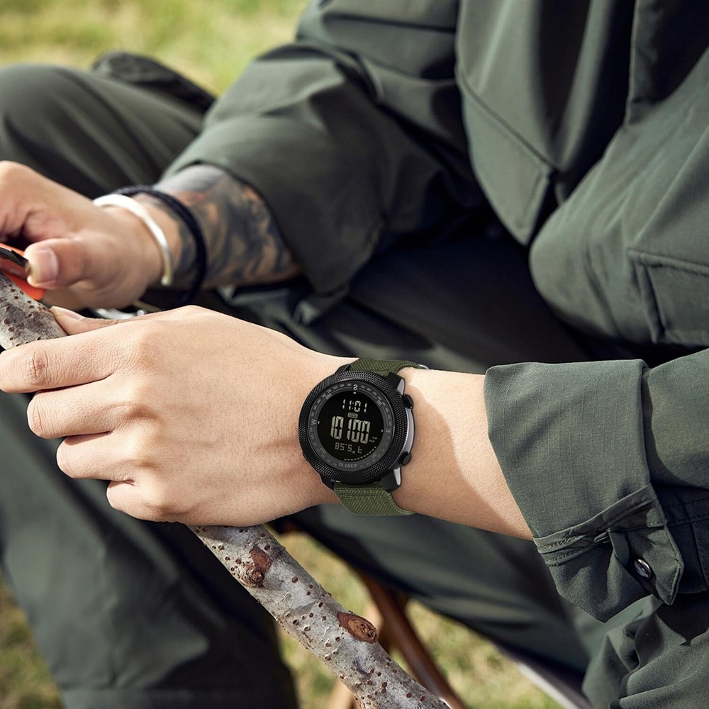 Digital Hiking Sport Watches for Men Tactical Training Military Compass Solid Watches Outdoor Multifunction Waterproof Altimeter Watches black MULTIFUNCTIONS: Altimeter. Barometer. Compass. Temperature. Pedometer. World time. 12/24H Format. Stopwatch. 50m waterproof. World time. Alarm. Countdown. EL backlight. OUTDOOR ACTIVITES: Pedometer, calorie keep track of your exercise and makes your work-out better. Compass quickly determines your direction. Barometer complemented the altimeter to provide accurate altitude information. The watch can also display the temperature. It’s a great companion for swimming, climbing, cycling, fishing etc. MATERIAL: Soft PU strap with adjustable length strap band, comfortable to wear. The dial window is made of resin mirror, high transparency, compressive and abrasion. PERFECT GIFT: The watch wrapped in a nice texture gift box and well protected. Perfect gift for boyfriend or dad. AFTER SALES: Please feel free to contact me if you have any questions about the product. we will resolve it for you as soon as possible. MULTIFUNCTIONS: Altimeter. Barometer. Compass. Temperature. Pedometer. World time. 12/24H Format. Stopwatch. 50m waterproof. World time. Alarm. Countdown. EL backlight.OUTDOOR ACTIVITES: Pedometer, calorie keep track of your exercise and makes your work-out better. Compass quickly determines your direction. Barometer complemented the altimeter to provide accurate altitude information. The watch can also display the temperature. It’s a great companion for swimming, climbing, cycling, fishing etc.MATERIAL: Soft PU strap with adjustable length strap band, comfortable to wear. The dial window is made of resin mirror, high transparency, compressive and abrasion.PERFECT GIFT: The watch wrapped in a nice texture gift box and well protected. Perfect gift for boyfriend or dad.