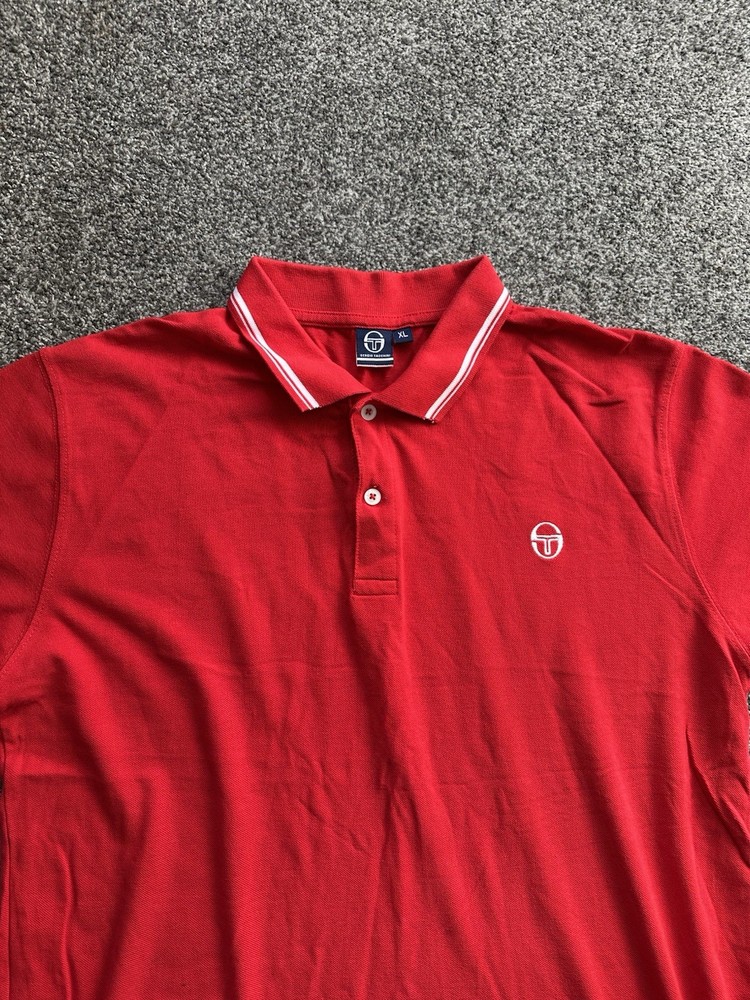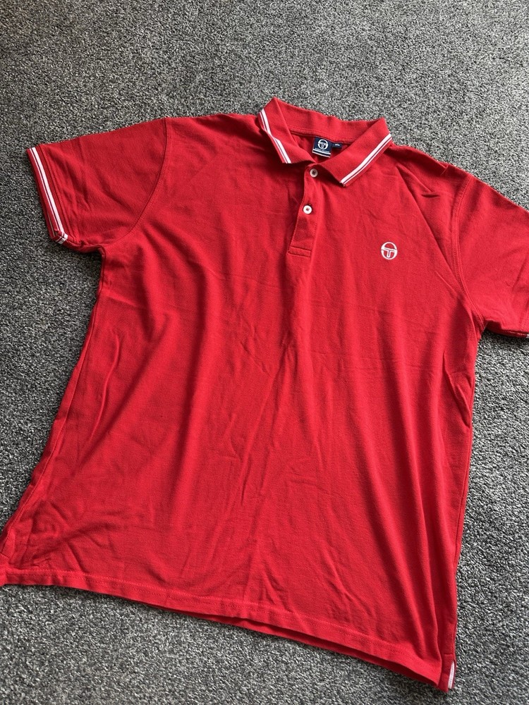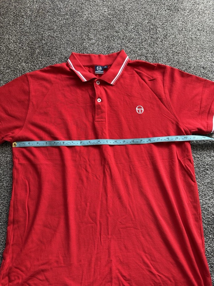 Elevate your wardrobe with the classic charm of a men's Sergio Tacchini polo shirt, perfectly tailored for a regular fit in a size XL. The timeless red design, accented with the brand's distinctive logo, exudes a retro vibe that makes it a versatile addition to any ensemble, whether you're aiming for a casual look or dressing up for an occasion. Crafted from breathable cotton canvas material, this polo shirt is ideal for all seasons, featuring a comfortable collared neckline and short sleeves. It's easy to care for, being machine washable, and has been manufactured with attention to detail in Bangladesh since 2010, ensuring both quality and style. NOTE: Pit to pit 21” roughly, see pics This item is used so please don’t expect perfection. May have minor marks and will need a good wash in my opinion. Generally in good used condition. Please note… I do not combine postage on auctions, purely as these are not always in the same location.. Any Q’s please don’t hesitate to get in touch. I’d be super grateful if you could save me as a seller, you’ll receive regular updates and offers. Thank you so much for your continued support.
