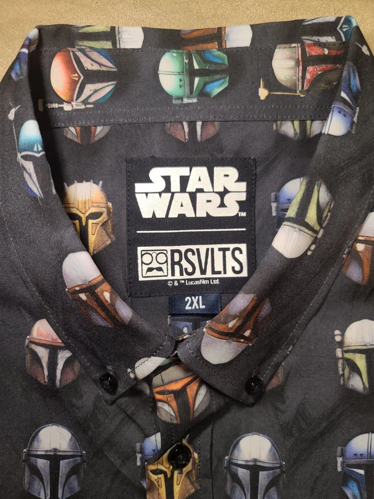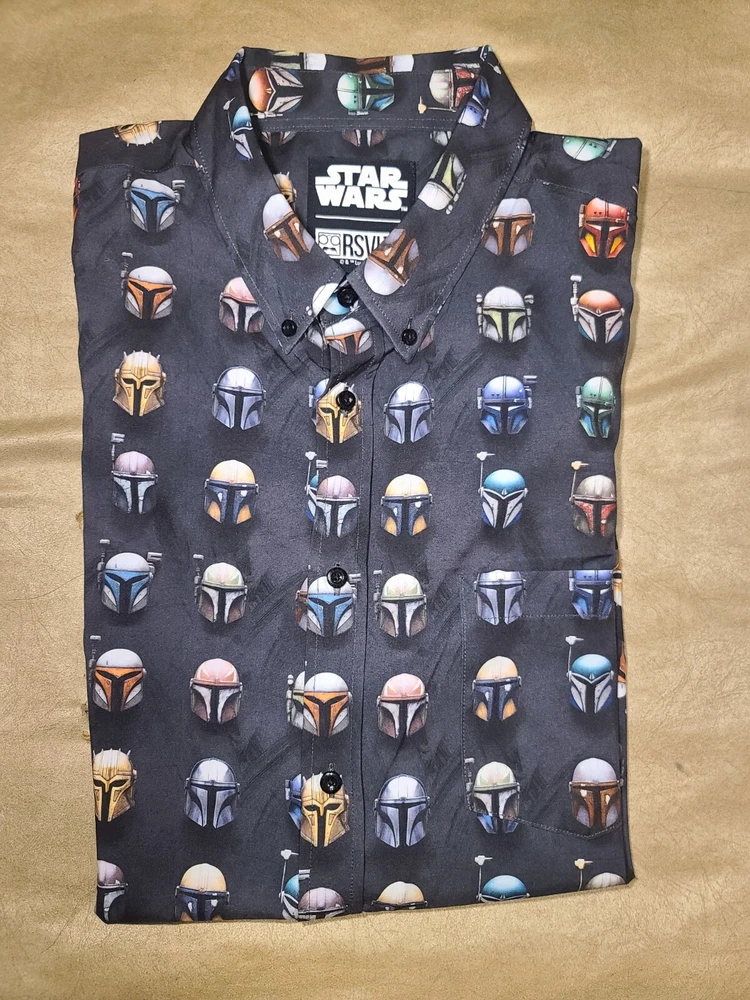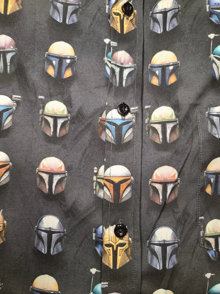 This Star Wars Mandalorian branded button-down shirt is a must-have for any fan of the iconic series. Featuring a graphic print of the beloved characters Boba Fett, Yoda, and the Mandalorian, this shirt is perfect for casual occasions. The shirt is made of lightweight polyester material with a poly/stretch fabric type, making it comfortable and easy to wear. The shirt has short sleeves, a collared neckline, and a button-down closure style. It comes in a regular fit with a chest size of 52 inches and a size type of regular. The shirt is also machine washable for easy care. With its multicolor design and Star Wars theme, this shirt is a great addition to any wardrobe.