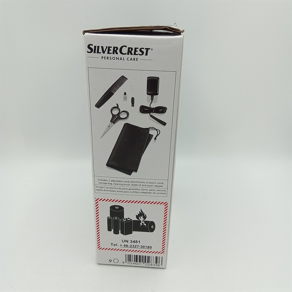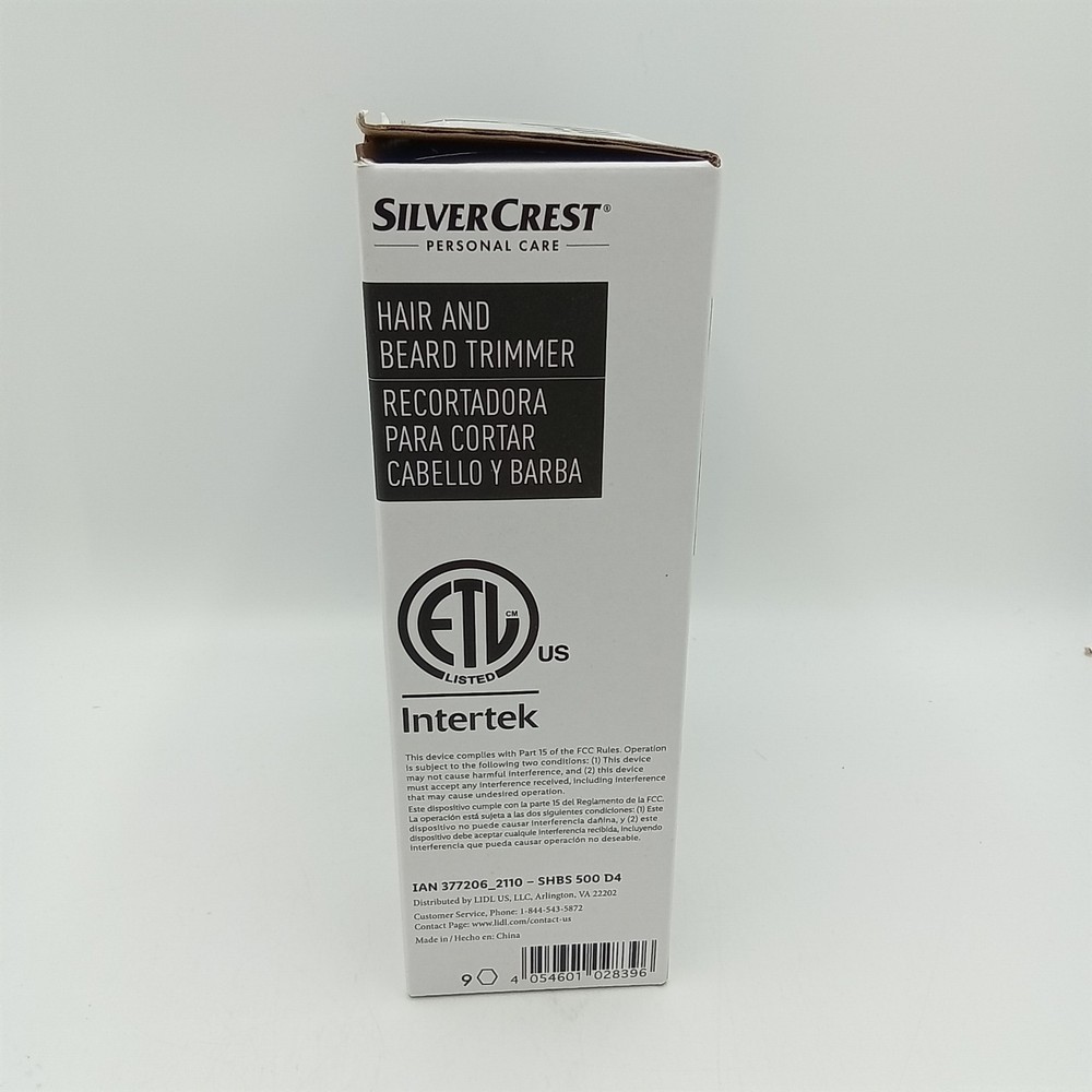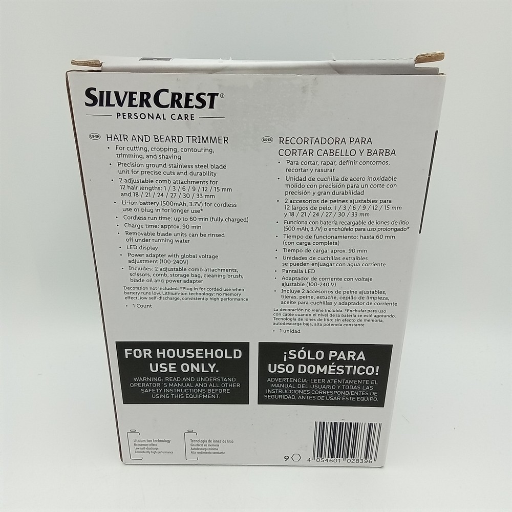 New in Box. Silver Crest Hair & Beard Trimmer for Men. Features: 2 adjustable comb attachments, LED display, stainless steel blade, run time is 60 mins, and charging time is 90 min. Included in box: 2 adjustable comb attachments, scissors, comb, storage bags, cleaning brush, blade oil, and power adapter. Great for home and travel. C2 SHELF