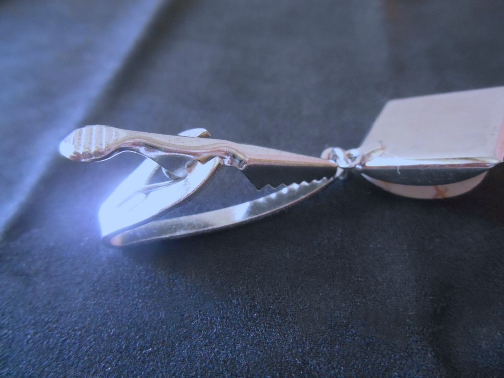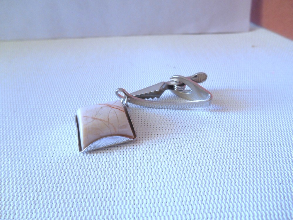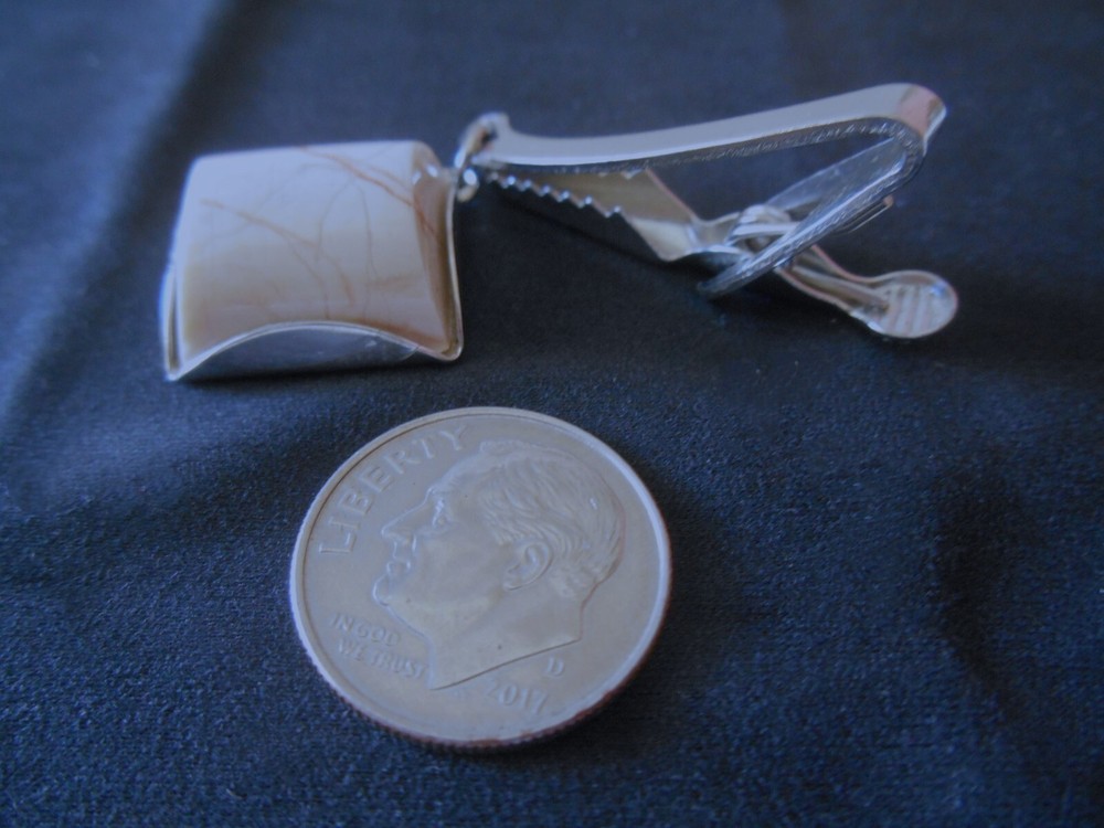 Please note: We do have a cat. Please read description before bidding. Up for bid is a silvertone & beige gemstone tie clasp. It measures approximately 1 1/4". It is in good vintage condition. Photo is of the actual item. I accept several different methods of payment. Payment must be made within 4 days after the close of the auction. *Combined shipping is available. **We ship to Alaska and Hawaii. ***Taxes and fees are the responsibility of the buyer.