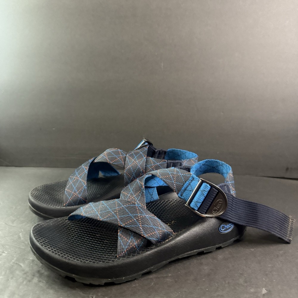 The product is a pair of Men’s Chaco adjustable sandals in size 9, featuring a blue and orange pattern. These sporty casual sandals are designed for hiking and other outdoor activities, with an adjustable fit for added comfort. The synthetic upper material and slip-on style make them durable and easy to wear for various occasions. Ideal for men who enjoy blending style and functionality in their footwear.