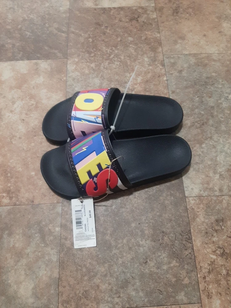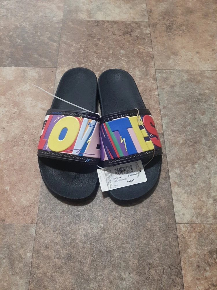 Elevate your style and comfort with this limited edition bundle of 3 pairs of men's slides, size 10. The striped pattern and multicolor design make these sandals perfect for any occasion, whether it's for travel, activewear, party/cocktail, casual, formal, workwear, or business. The cushioned, lightweight, and adjustable features of these slides make them perfect for any season, including winter, summer, fall, and spring. The outsole material is made of fabric and the insole material is made of rubber. These slides are vintage and belong to the Under Armour and Adidas product lines. The North Face character and the Under Armour theme add to the style of these slides. Get ready to slip into comfort with these stylish slides that are perfect for any occasion.