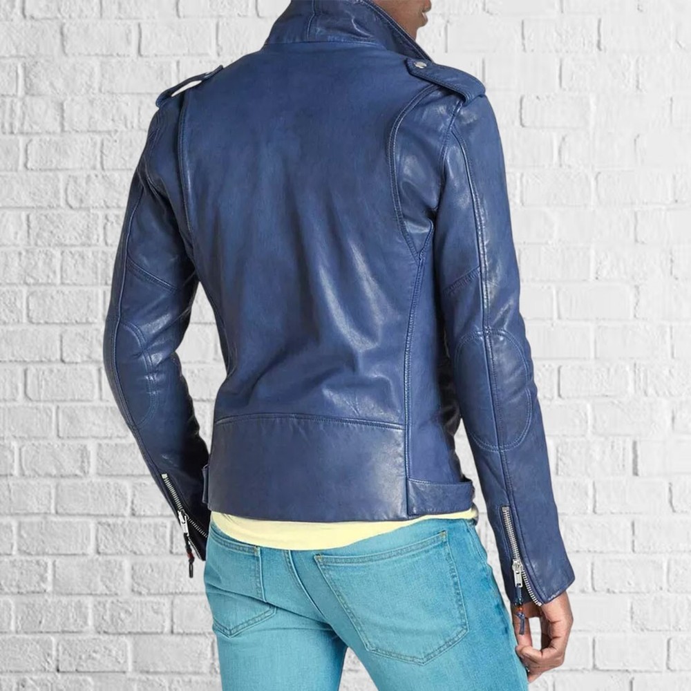 This jacket is a total game-changer! The rich blue color pops, and the lambskin leather feels buttery soft yet durable. The slim fit gives a sharp, tailored look, while the biker details like the shoulder straps and zip accents add just the right amount of edge. Super comfortable and surprisingly lightweight—perfect for riding or just rocking a bold everyday style. Definitely runs true to size if you follow the measurements. Worth every penny!