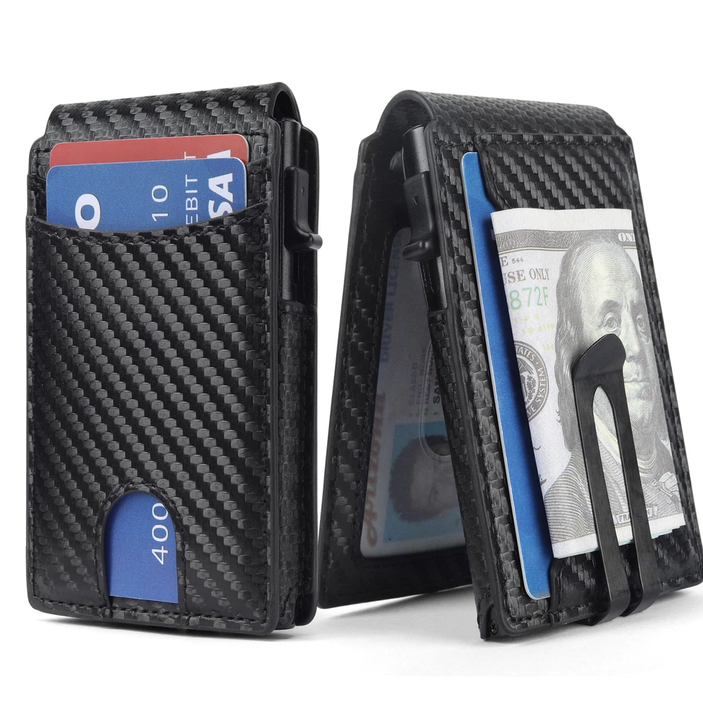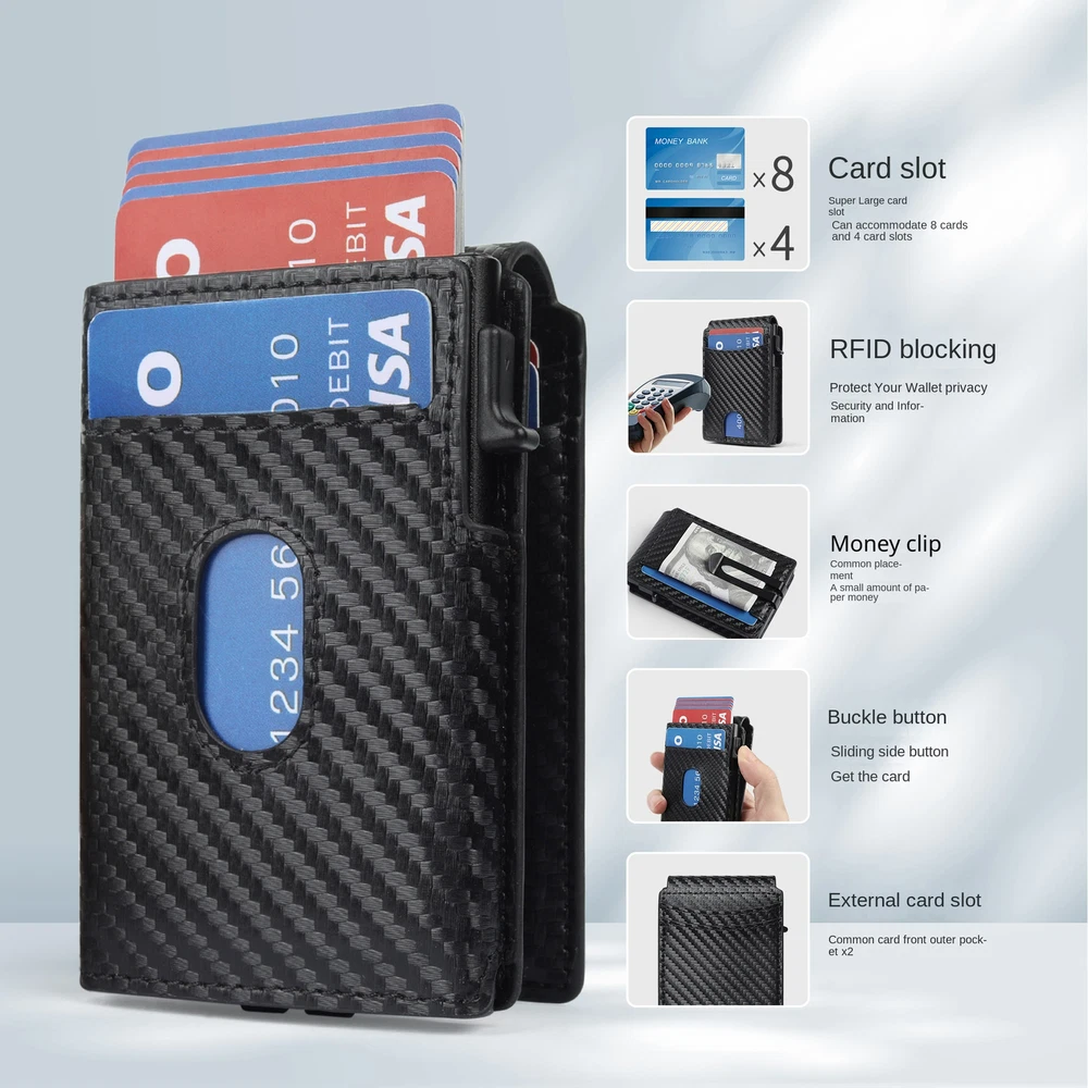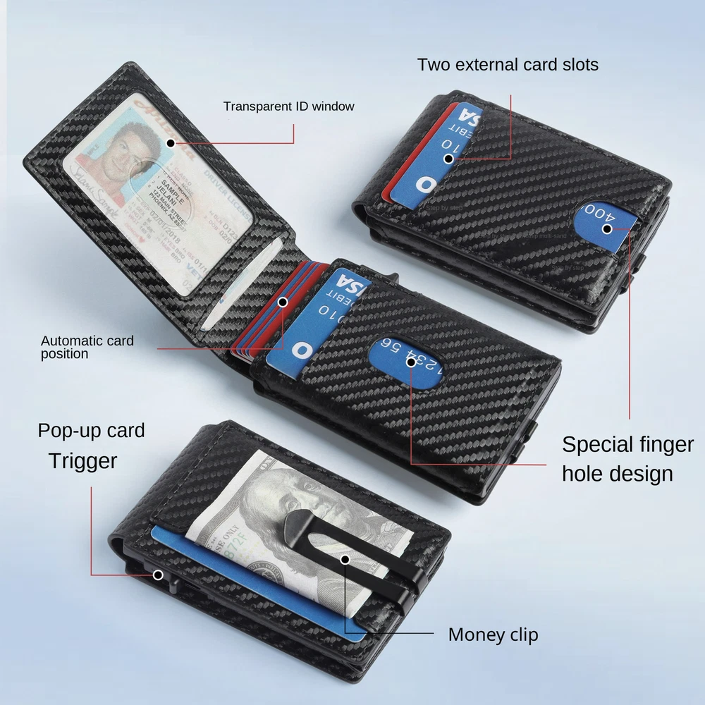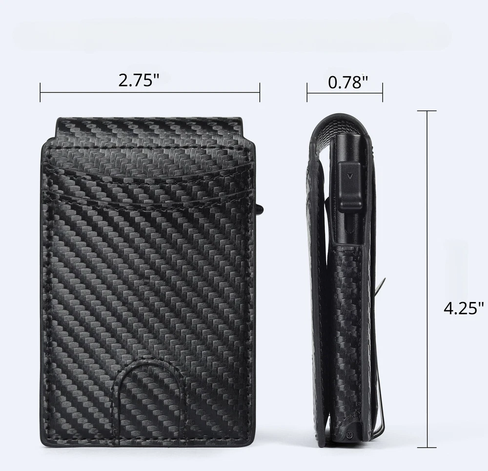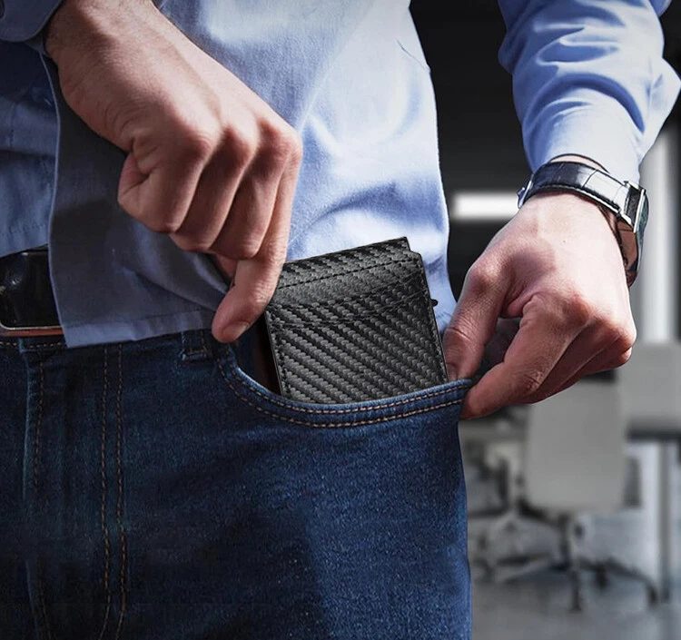 Mens Slim Minimalist Wallet with Money Clip,Pop Up Card Holder Bifold Wallet Black Carbon Fiber Men Wallet with Pop Up Card Holder and RFID Blocking Technology. This bifold wallet is designed with a slim and minimalist profile for a sleek and stylish look. It features 4 external card slots and pop up card holder can hold up to 8-10 cards, with clear ID windows for easy access. The pop-up card holder mechanism offers convenience and ease of use, allowing you to access your cards quickly. The wallet is made from high-quality carbon fiber, ensuring durability and longevity. With RFID blocking technology, your cards and personal information are protected from potential theft. Experience the perfect combination of style and functionality. Enjoy the convenience of pop-up card holder mechanism and the peace of mind provided by RFID blocking technology. Quick access: Instant card access at the tap of a button by a single hand. Large capacity: Stores 10 cards and 10 bills total. The pop-up aluminum card holder stores 6 cards, the exteral card slots store 4 cards the money clip stores 10+ bills, and the clear ID window. Rfid Blocking Protection: The RFID blocking technology safeguards your cards from unauthorized scanning, protecting you against the risk of electronic pickpockets. Minimalist slim size: 4.25 * 2.75 * 0.78 inch - is designed to fit directly in the front pocket for easy carrying. High-Quality Material: Handcrafted from premium genuine leather and Aluminum brings a long and comfortable user experience.
