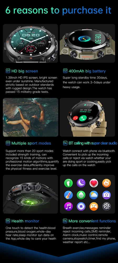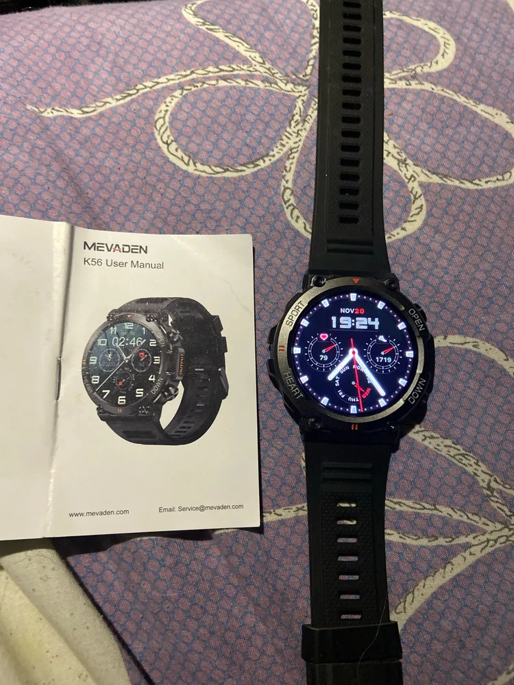 K56Pro Smart Watch for Men Heart Rate Blood Bluetooth Sport 400mAh Long Standby 1.39 Inch 360*360 HD Screen Outdoors Smartwatch Item Description Description Product parameters -System requirements: Android 4.4 and above, IOS 8.0 and above, supporting Bluetooth 5.0 -Bluetooth version: BLE 5.0 -Main control chip: Realtek8762DK -Memory: Flash 128MB -Screen resolution: 360 * 360 -Heart rate: 3605 -Horn: 0916 -Battery capacity: 400mA -Standby time: about 30 days -Working time: around 5-10 days -Motor: Built in, vibration reminder -APP: Dafit Watch features -1.39 inch IPS screen -Detachable 22mm strap Standard -Multiple watch faces pushing,Customized watch faces -Bluetooth calling/BT music(Superior clear audio like sound effect),Weather -Heart rate detection/Blood pressure detection/Blood oxygen detection/Wole-day heart rate monitor -Timer ,Pedometer,Calorie Consumption,Distance Calculation,Heart rate,Blood pressure,Blood oxygen,Sleep time /quality,On & Off dispaly,Multiple sport modes -Sleep detection (Sleep time ,Sleep quality) -Calls to remind,SMS Reminder,Third-party messaging reminder Multilingual push,Clock alarm,Remote Camera,Sedentary reminder -400mAh big battery,super long standby time,Bright screen under sunshine Language Watch device language:Chinese, English, Russian,German, Japanese, French, Spanish, Portuguese, Ukrainian,Italian,Polish Message push language:Chinese, English, Russian,German, Japanese, French, Spanish, Portuguese, Ukrainian, Italian,Polish APP language:Chinese, English, Russian,German, Japanese, French, Spanish, Portuguese, Ukrainian, Italian,Polish Package includes Main unit, charger, wrist strap, instruction manual, packing box After receiving the watch, please charge it first. Due to the long-term logistics, the battery of the watch is low. Before using, please scan the QR code on the instruction manual to download the APP and connect the watch through the APP. Payment Free Worldwide Shipping Shipping safe payment . Return 30 Day's returns