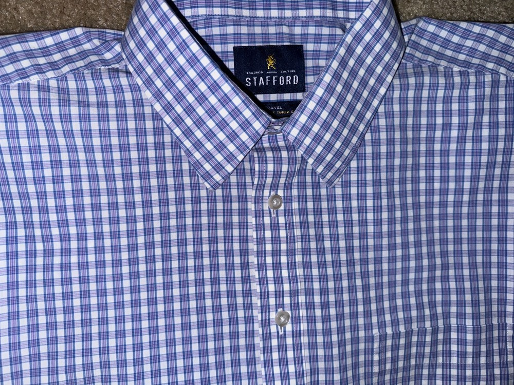 Mens Stafford Travel Performance Super Shirt Long Sleeve Plaid Button Up 16 1/2 32-33 60-40 cotton/polyester blend Regular fit Great looking blue, purple and white multi plaid long sleeve button front shirt Pocket Excellent used condition VERY NICE SHIRT FROM SMOKE FREE HOME. FAST SHIPPING WITH TRACKING INFORMATION PROVIDED.