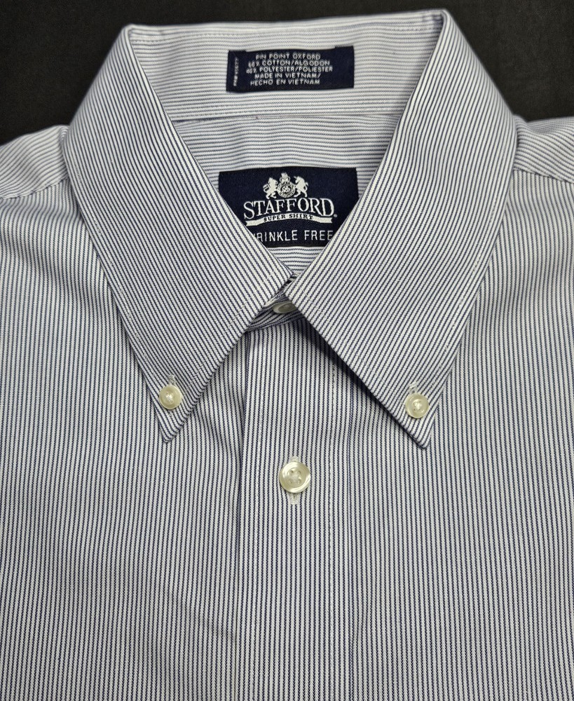 Mens Stafford Super Shirt Long Sleeve Striped Button Up Shirt Size 16 1/2 32-33 60-40 cotton/polyester blend Wrinkle free pinpoint oxford Great looking blue and white vertical striped long sleeve button up shirt Pocket Excellent used condition VERY NICE SHIRT FROM SMOKE FREE HOME. FAST SHIPPING WITH TRACKING INFORMATION PROVIDED.
